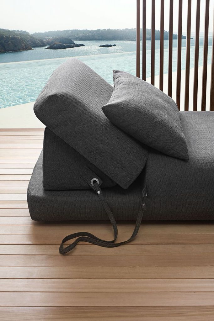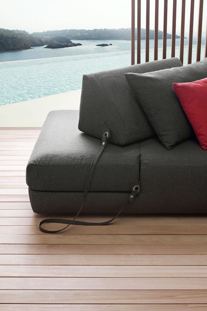 The abundant upholstered volumes bring to the outdoor the comfort usually dedicated to the interior design. The monolithic seat with no legs makes the sofa a single block of soft relaxing experience.