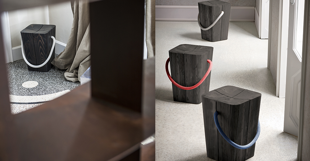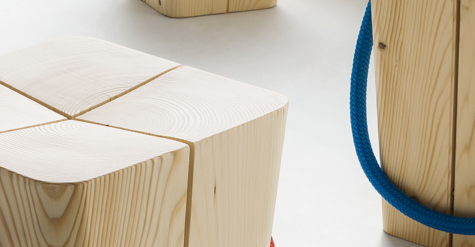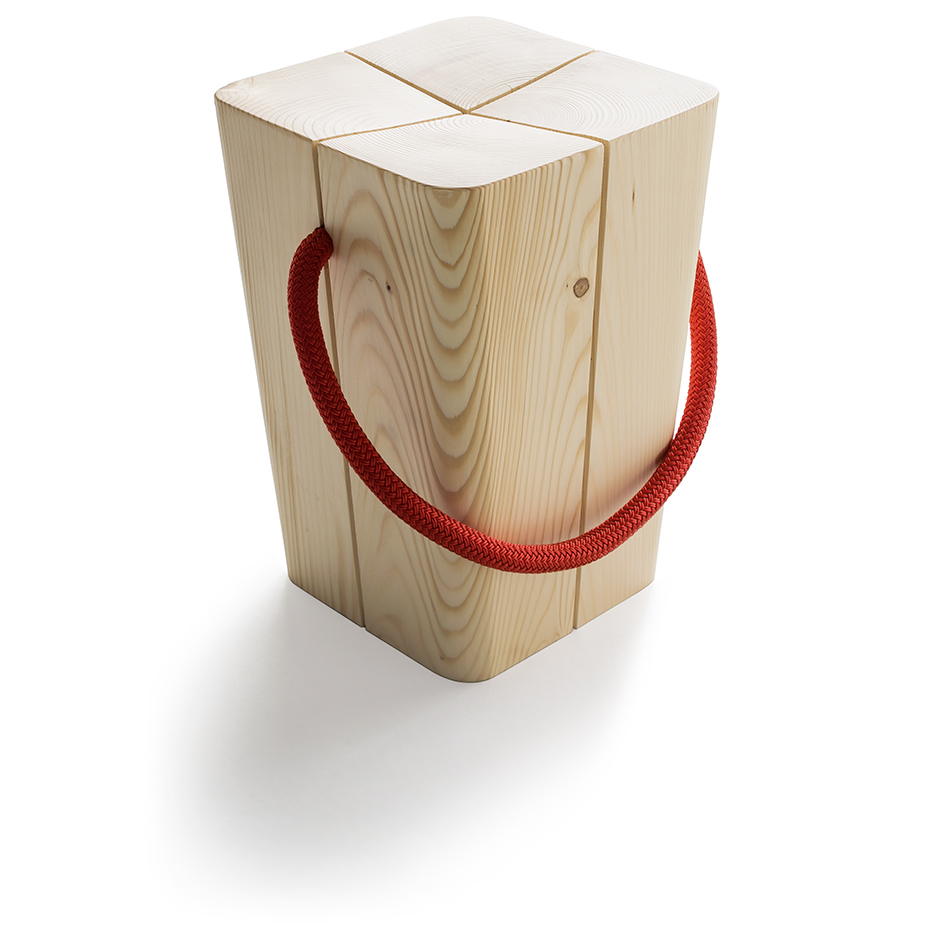 HUG is a stool in solid spruce designed by Emo Design. Hand-made and characterized by the use of irregular pieces of wood with a worn look, this stool surprises and attracts. The detail of the colored rope, the most refined and industrial accessory, in addition to allowing its transport, puts itself ironically in contrast with the naturalness of the main body, giving strong personality to a simple "piece of wood".