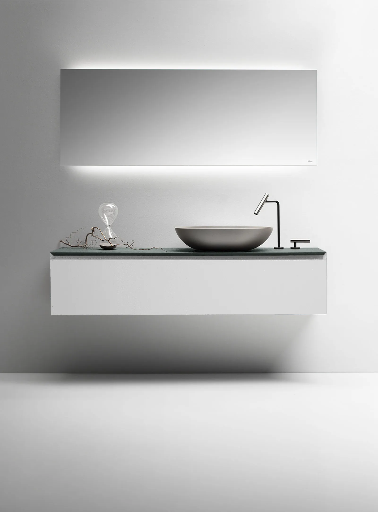 Mobile bagno porta lavabo con cassetto, top integrato e lavabo da appoggio, dimensioni da 140cm a 160cm. Piano integrato in Fenix con taglio a 45°. Lavabo in Cristalplant? Bio Active opaco modello Ciotola con copri piletta in Cristalplant? Bio Active, disponibile nelle versioni centrato, a destra e a sinistra del mobile. Basi del mobile con frontali e fianchi a 45°. I cassetti sono completamente estraibili e sono disponibili con maniglie opzionali a gola o premi apri.