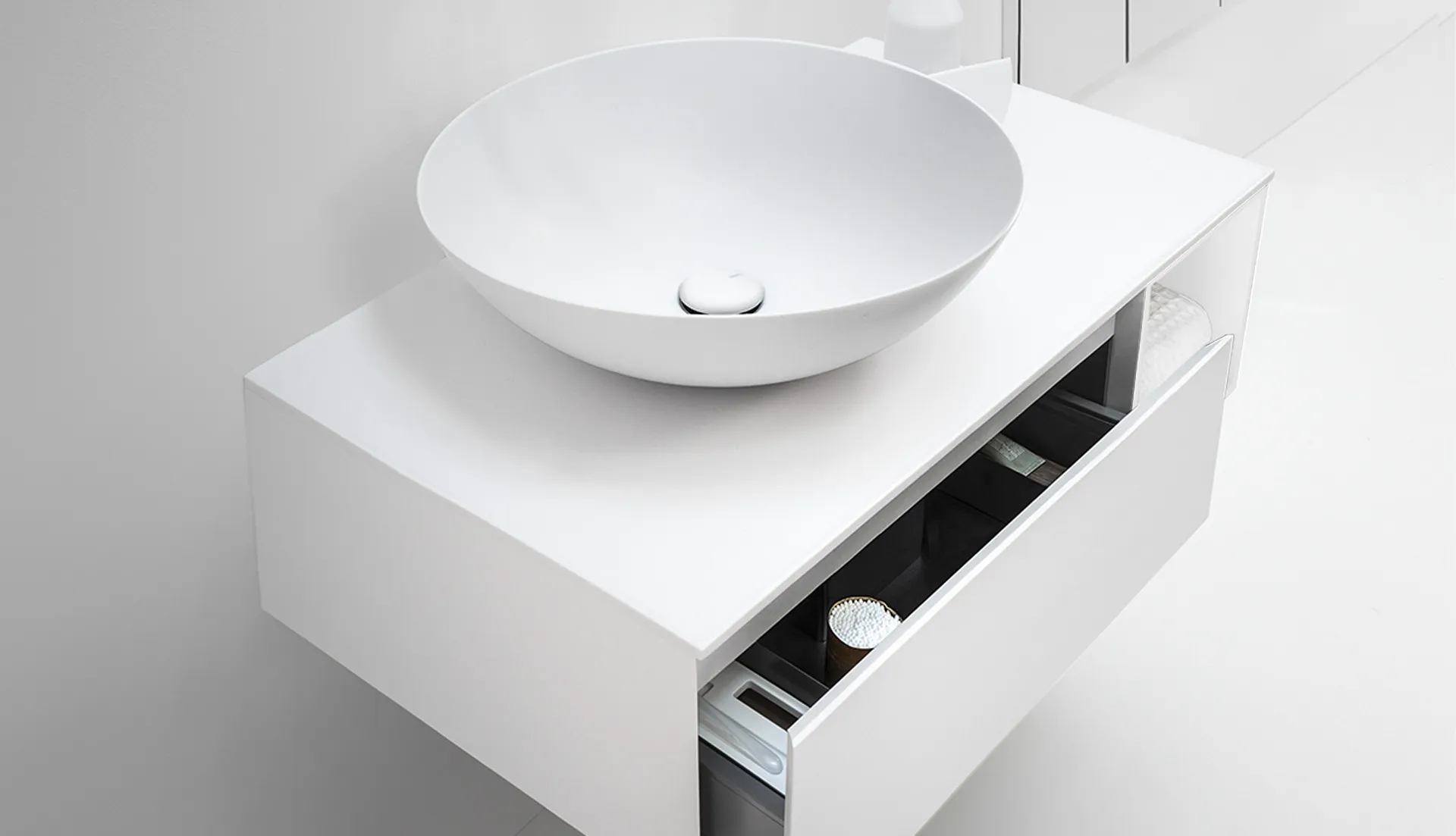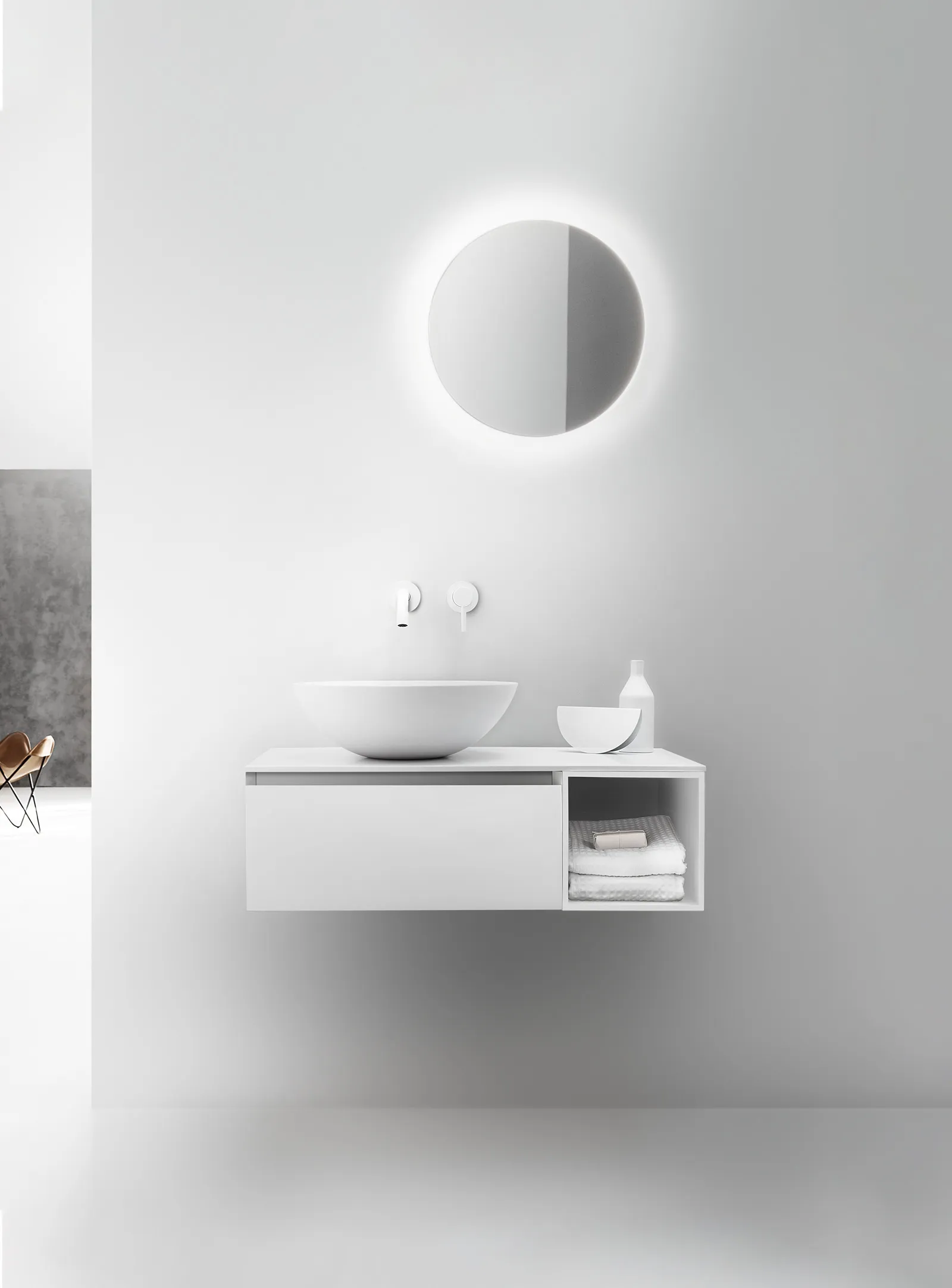 Mobile bagno porta lavabo con un cassetto e vano a giorno, larghezza da 80cm a 100cm. Vano a giorno con spessore 10mm disponibile su lato destro o sinistro del mobile. Top in Cristalplant? Bio Active opaco con profilo salva goccia. Lavabo da appoggio in Cristalplant? Bio Active opaco modello Ciotola rotondo con diametro 43cm e copri piletta in Cristalplant? Bio Active. Mobile con lavorazioni a 45° su frontali e corpo.Il cassetto è completamente estraibile ed è disponibile con maniglie opzionali a gola o premi apri.