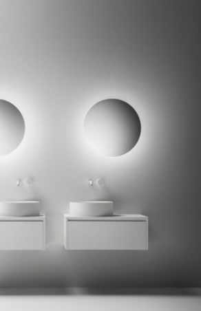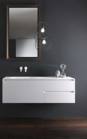 Mobile bagno porta lavabo con cassetto, top integrato e lavabo da appoggio, dimensioni da 140cm a 160cm. Piano integrato in Fenix con taglio a 45°. Lavabo in Cristalplant? Bio Active opaco modello Ciotola con copri piletta in Cristalplant? Bio Active, disponibile nelle versioni centrato, a destra e a sinistra del mobile. Basi del mobile con frontali e fianchi a 45°. I cassetti sono completamente estraibili e sono disponibili con maniglie opzionali a gola o premi apri.