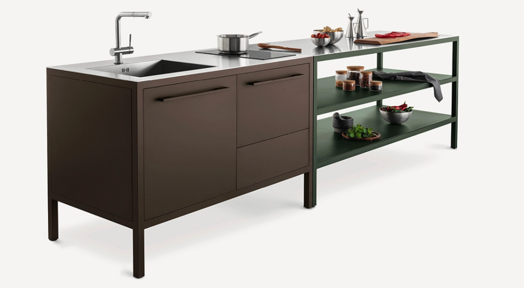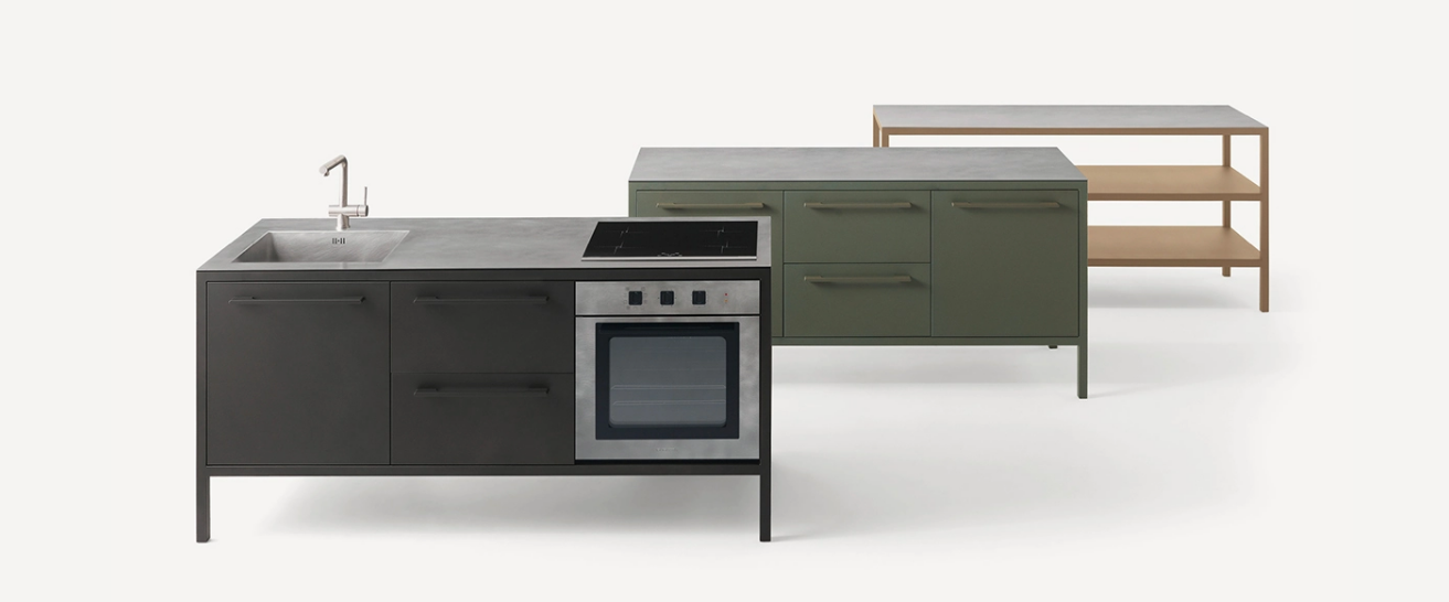 I banconi Frame sono proposti con top in acciaio Barazza, in Fenix NTM o in metallo verniciato. Il telaio, in tubo quadro saldato, è sempre in vista ed è garanzia di grande solidità