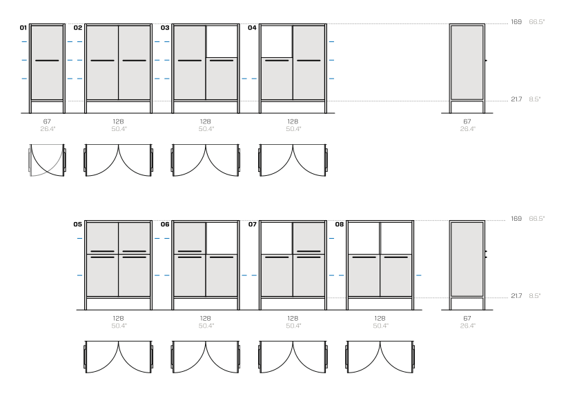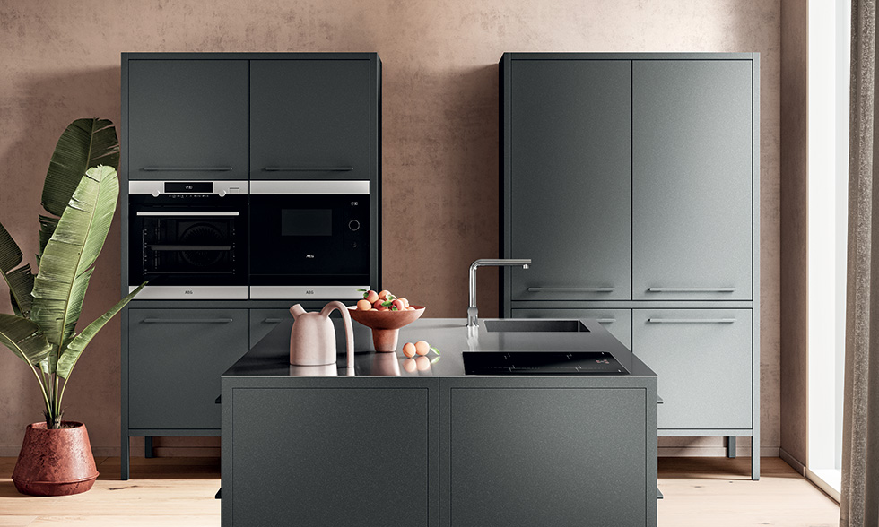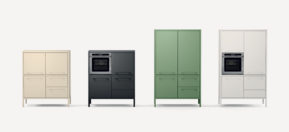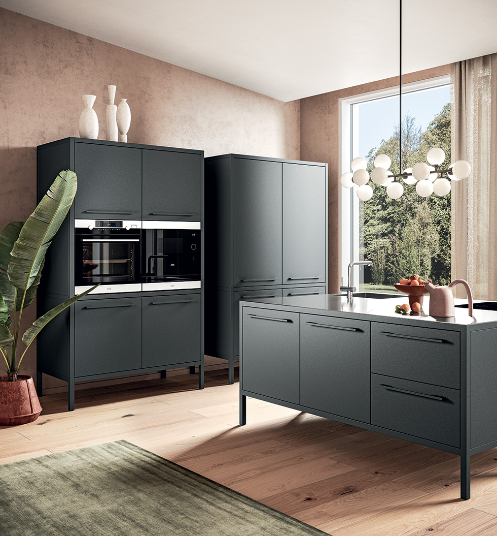 Le colonne Frame sono proposte in due altezze e possono essere dotate di ante ed elettrodomestici, senza limiti compositivi. La sorprendente palette cromatica, composta da 47 finiture, consente di personalizzare il prodotto adattandolo a ogni ambiente.