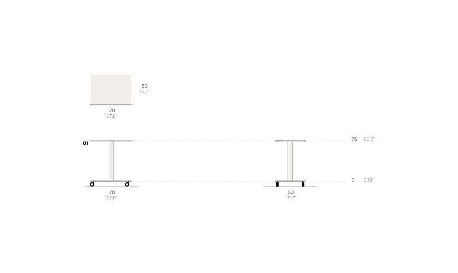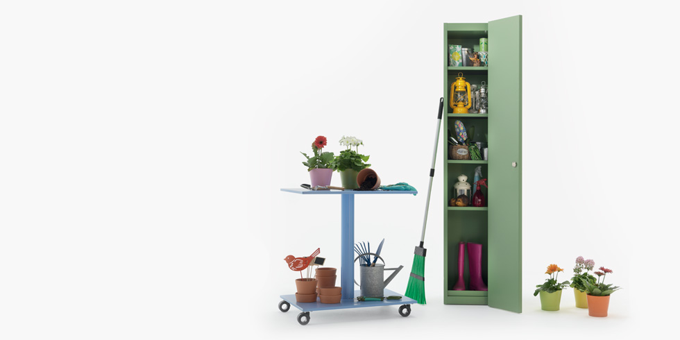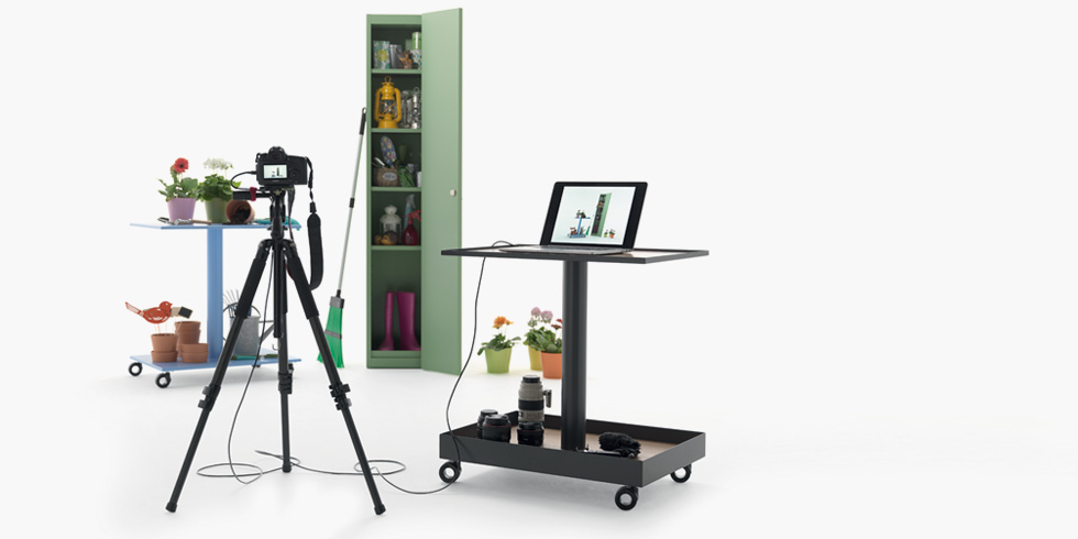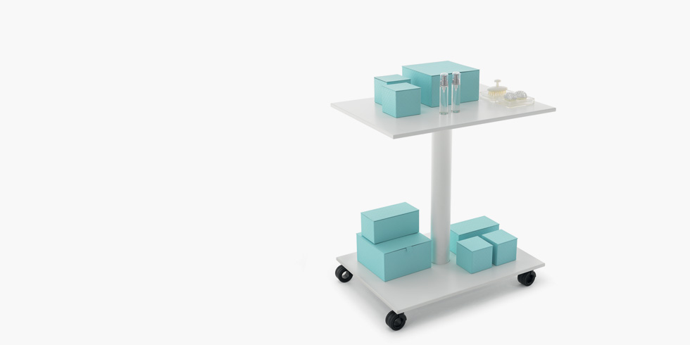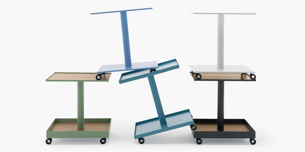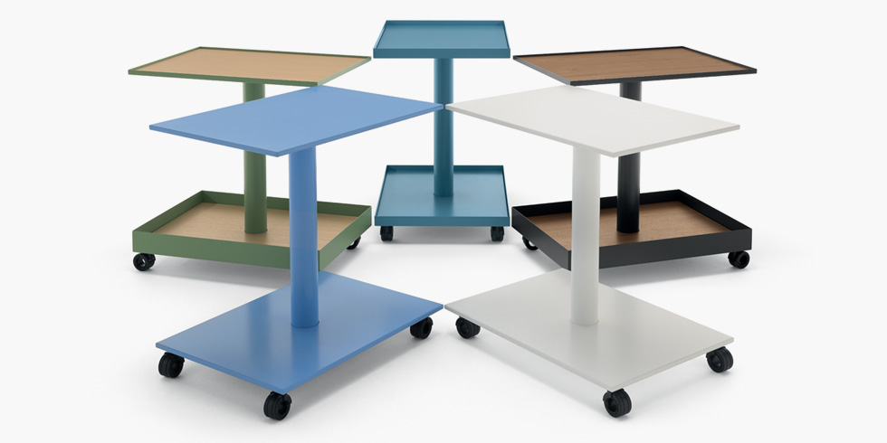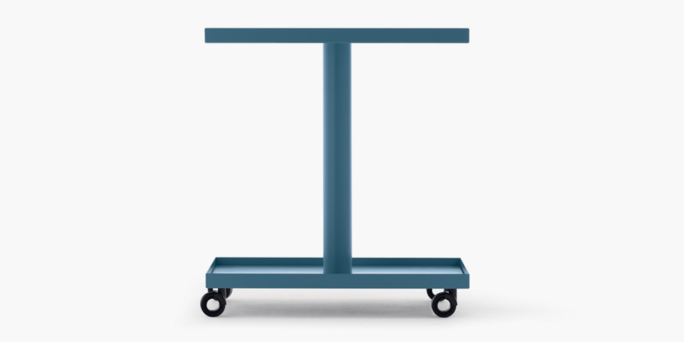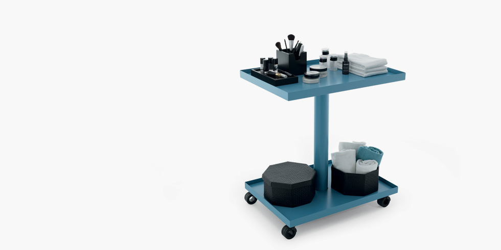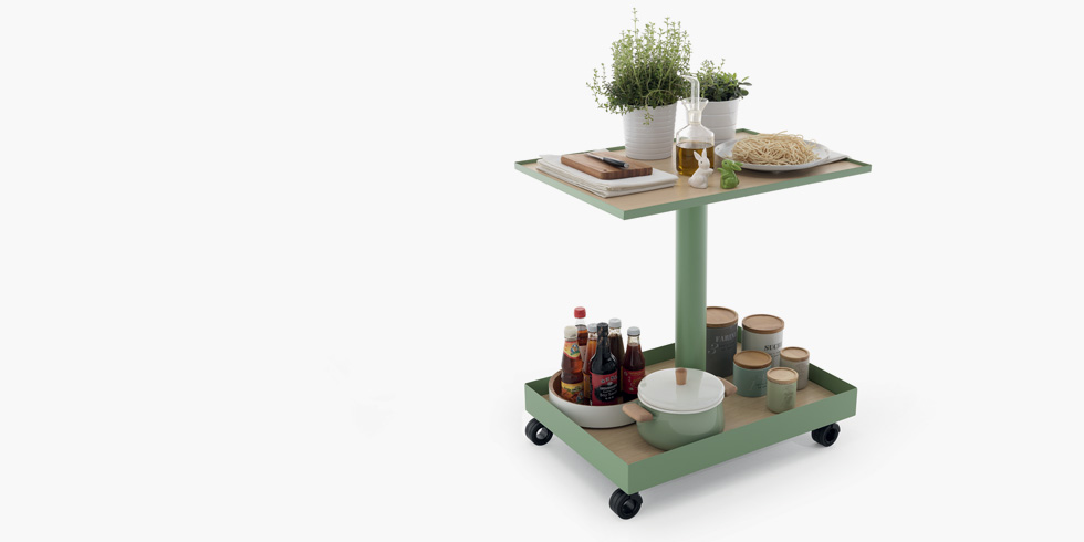 Pillar è un carrello senza compromessi: quattro ruote, due ripiani e una robusta colonna portante.