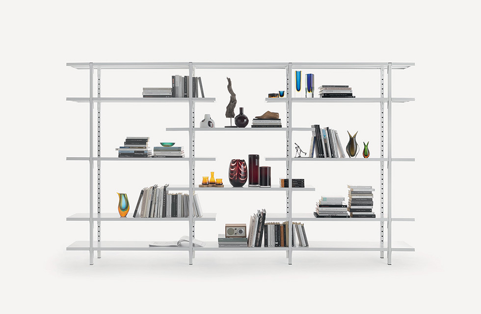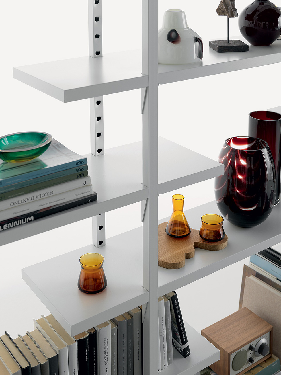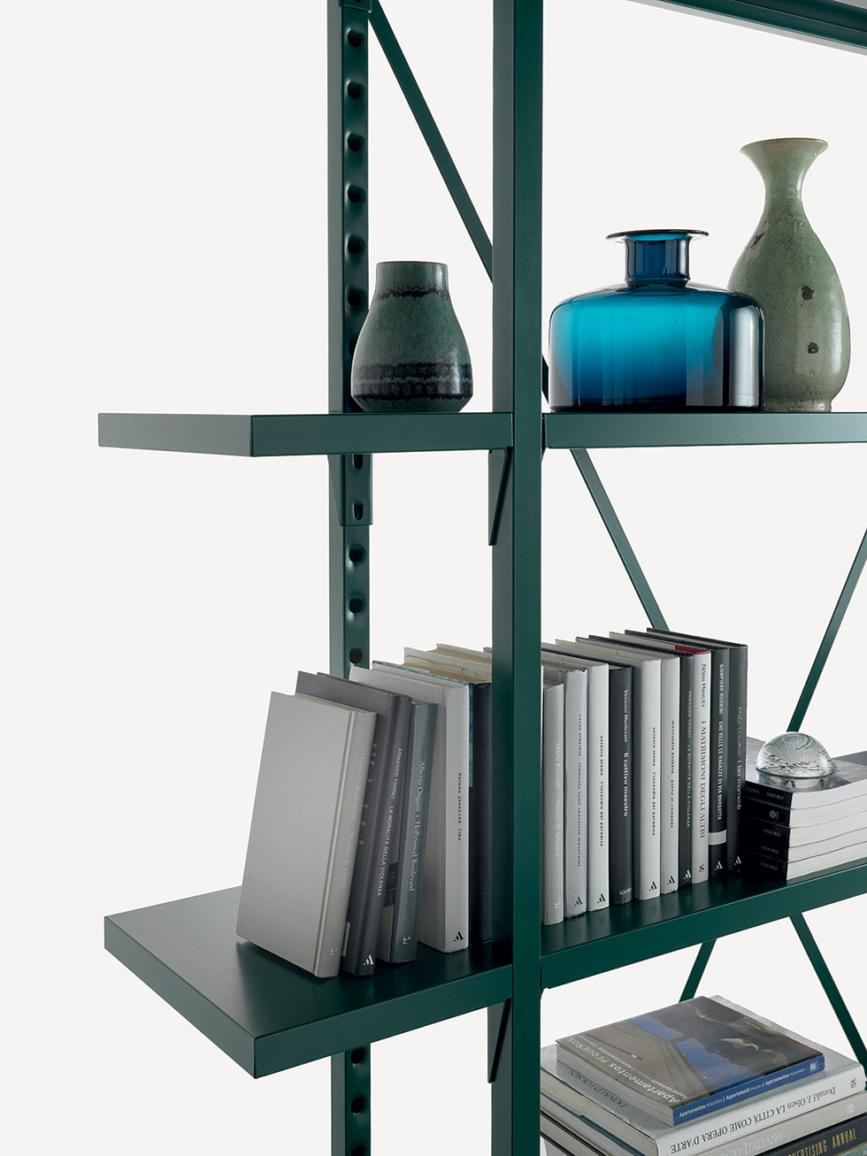 Libreria componibile interamente in metallo. Lo storico sistema di ripiani a ganci Fantin si arricchisce con l’inserimento dei ripiani a sbalzo, che permettono di arredare ogni ambiente al meglio e con una versatilità senza limiti.