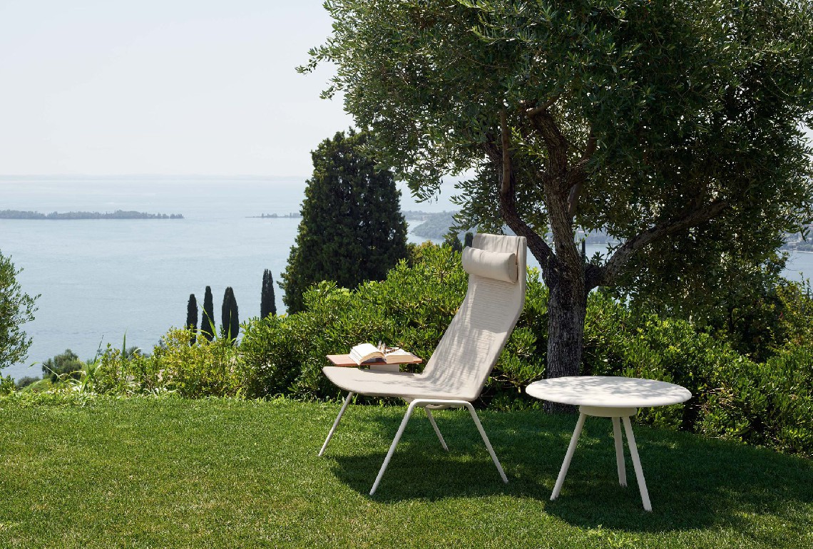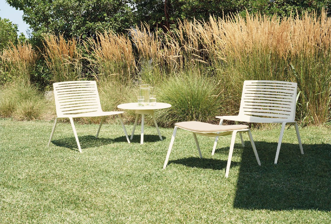 The encounter between the solidity of the material and the light weight of the shapes. In the Zebra collection, the die cast aluminium is structured by removal, which with a game of blocks and voids, illuminated by the sun, designs mesmerising geometric shapes on the ground. For even greater comfort, cushions are available for the seat and backrest, covered with fabrics which are suitable for outdoor use: resistant to water, to stains, to UV rays, and to abrasions.