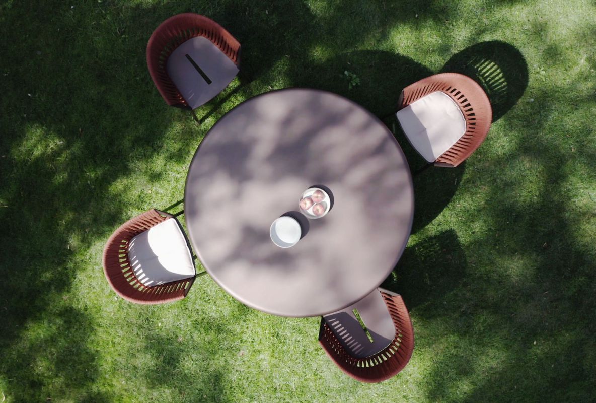 Versatility is the distinguishing feature of this collection of outdoor garden tables, which draws its inspiration from the peculiar shapes of the stone pine tree. The slimness of the frame is only apparent: the legs - like robust roots - in fact support elegant aluminium, speckled aluminium or stoneware table tops.