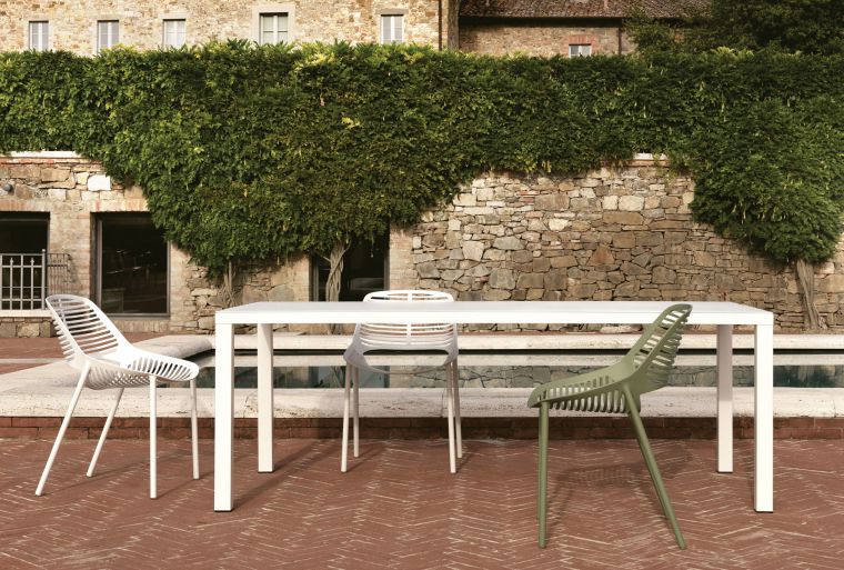 The Easy collection comprises: chair, chair with armrests, stool and tables with customisable length, width and height.