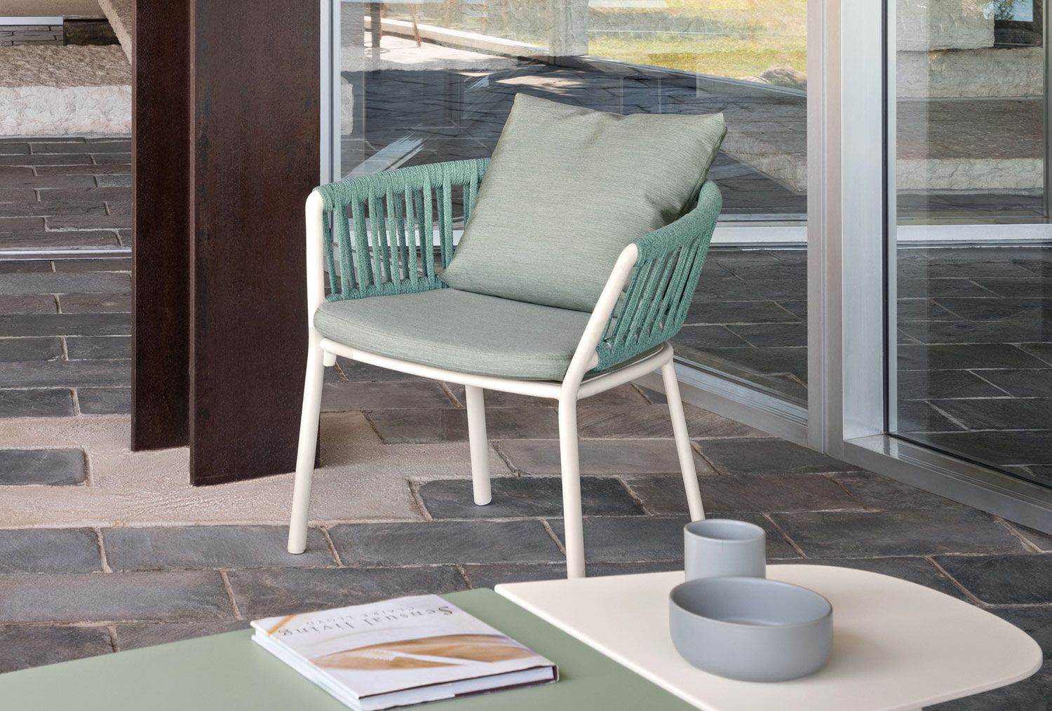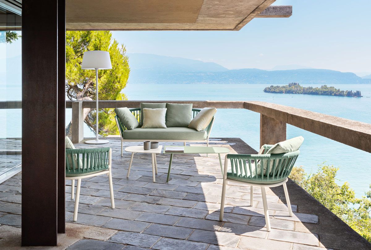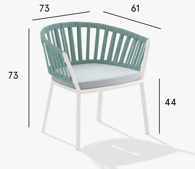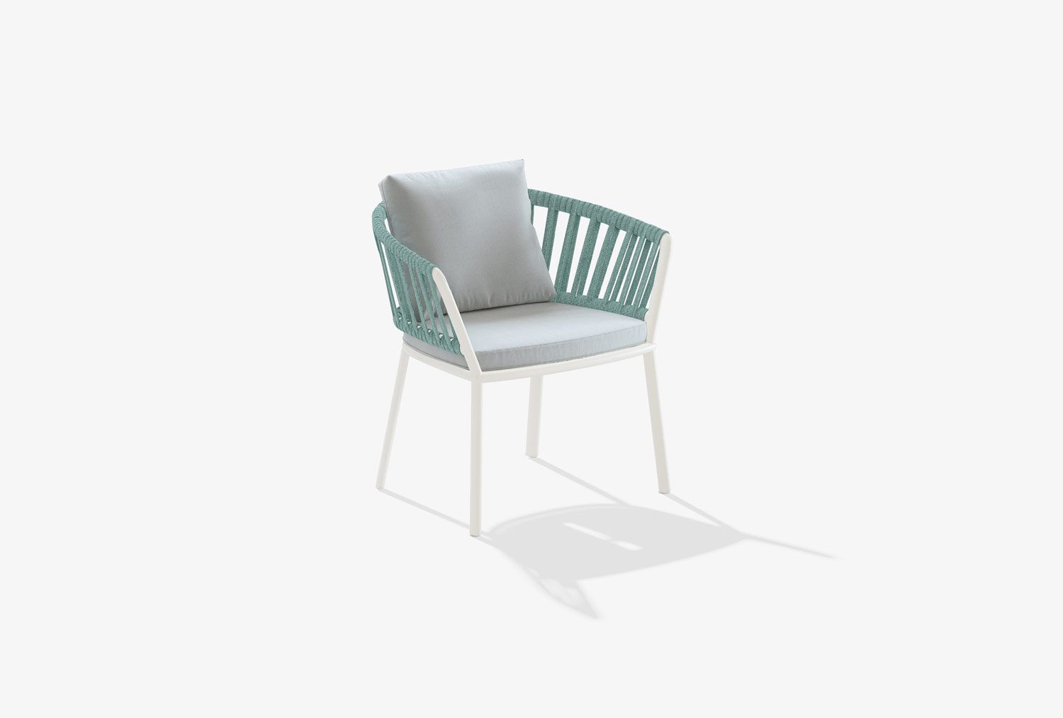The Ria collection includes: dining armchair in the aluminium, partially woven rope, fully woven rope and with quilted backrest versions, 2/3-seater sofas, armchair, lounge chair and daybed in the woven rope versions.