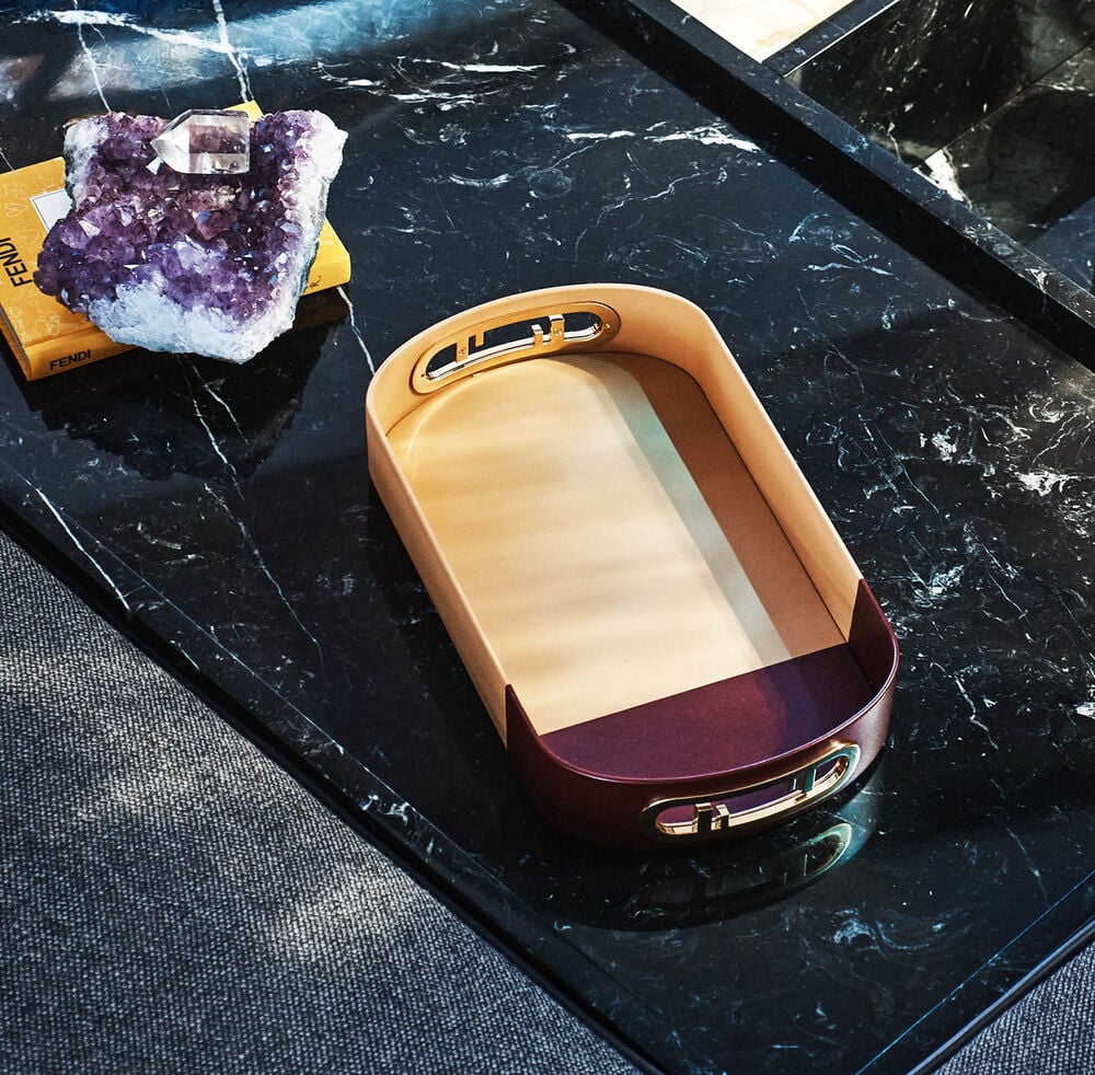 The Fendi O’Lock series of trays is inspired by the iconic Fendi jewellery collection. The distinctive oval form is introduced in the form of metal handles that transform a simple tray into a stylish object of design. The pleasing geometry of circular and oval curves in natural materials such as leather and wood is showcased by a striking colour block effect or the classic Pequin striped motif.