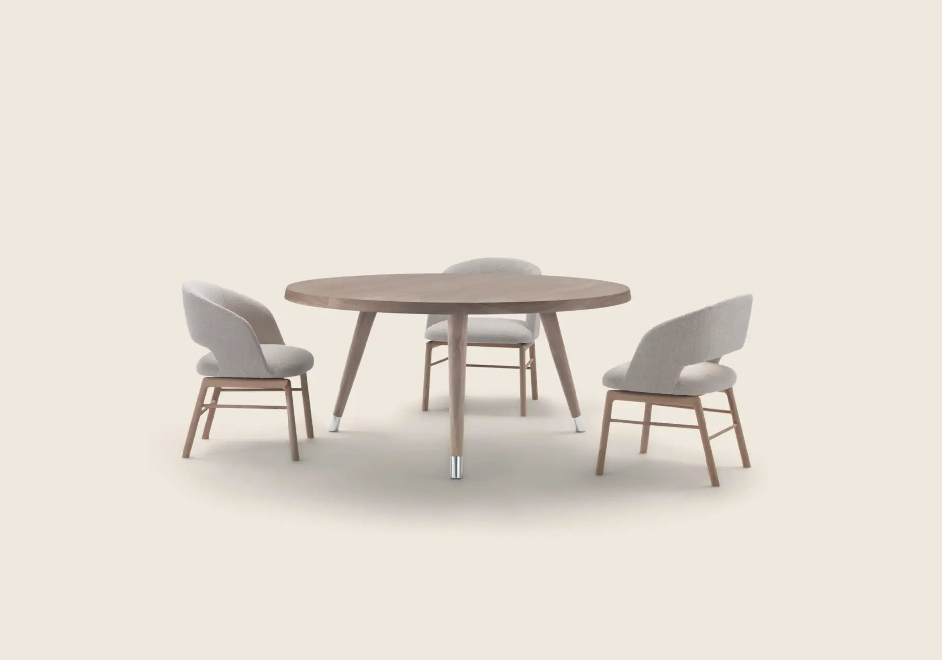A minimalist-inspired support base composed of tapered legs in turned wood finished with elegant metal tips supports thick tabletops with rounded corners.