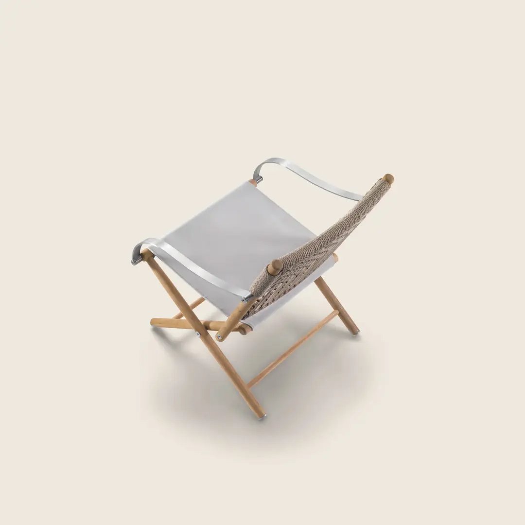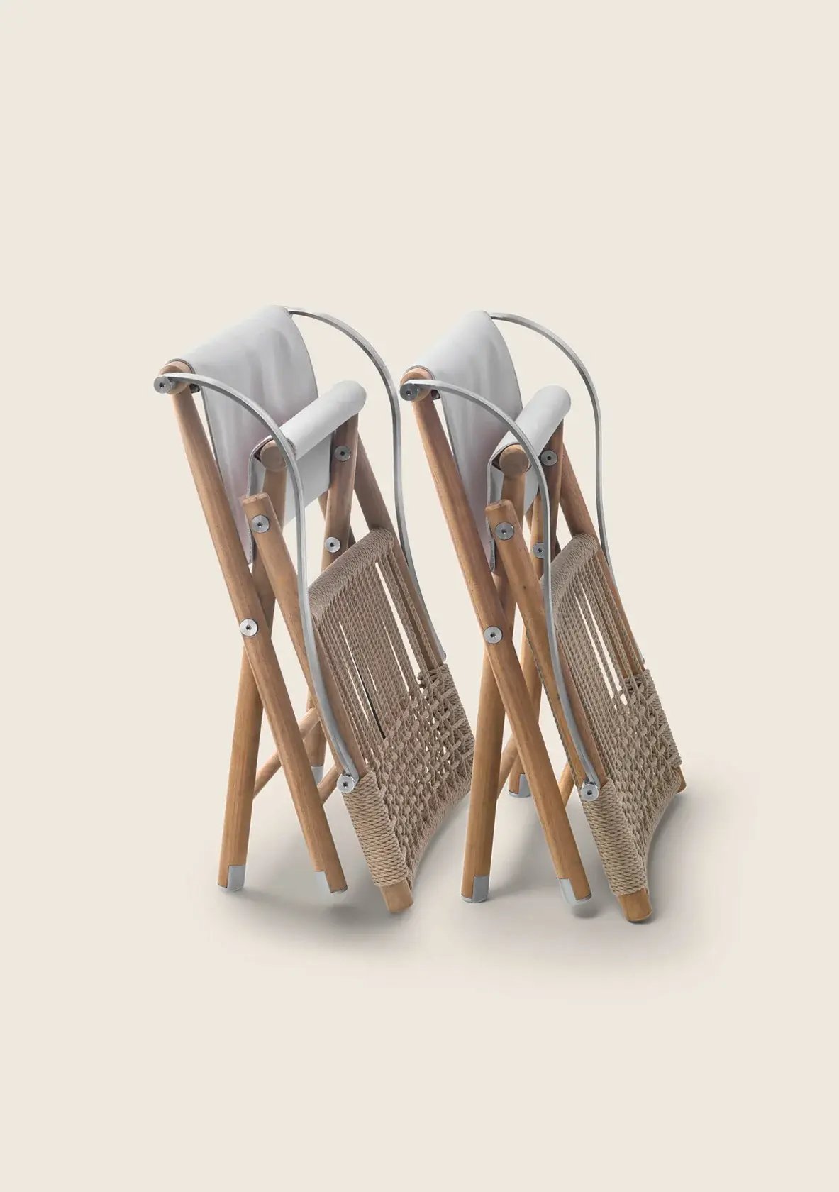 Its components – solid iroko wood, hand-turned and finished for the structure, epoxy powder-coated stainless steel for the armrests, woven polypropylene or PVC cord for the backrest and sturdy canvas for the seat – guarantee high quality and durability, with exceptional resistance to weather and wear over time.
