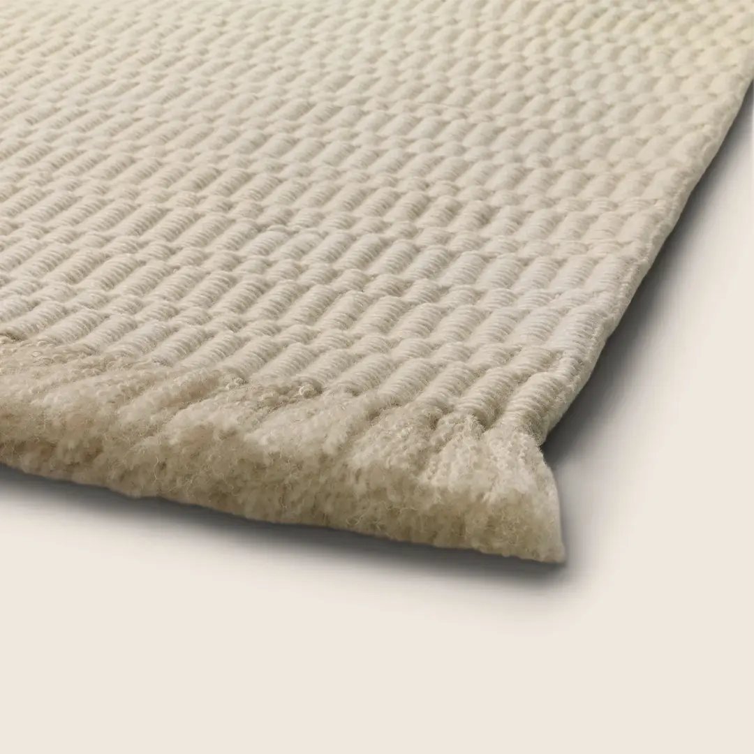 The Mori rug is inspired by two intersecting worlds – one of sophisticated contemporary European textile art, and the other of natural influences, made up of woven herbs moved by the wind, wheat stalks bound for drying. Tensions, knotting and constrictions that open into fringe, free and wild, characterize this rug hand-made from New Zealand wool and cotton.