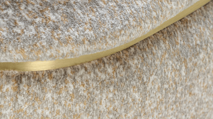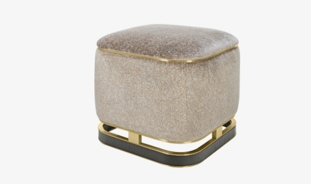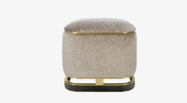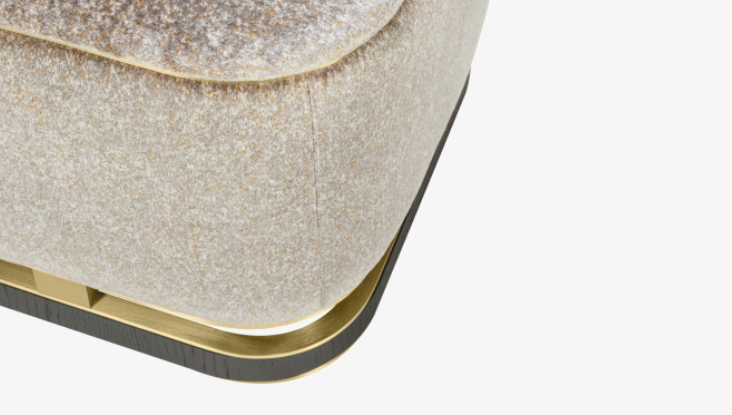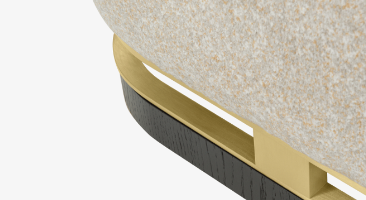 The design of the upholstered ASHI stool is elevated by a sculptural base crafted from wood veneer and brushed brass.