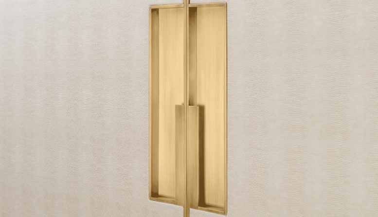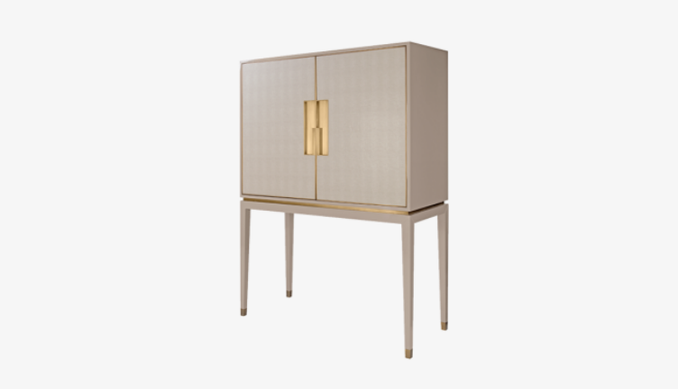 An unexpected use of rarefied materials imbues the ALPINE tall cabinet with a quiet luxury. Note the leather-covered door fronts, brushed-brass handles and trim, mirrored interior back and suede-lined drawer. Storage never looked so suave.