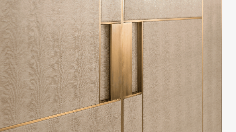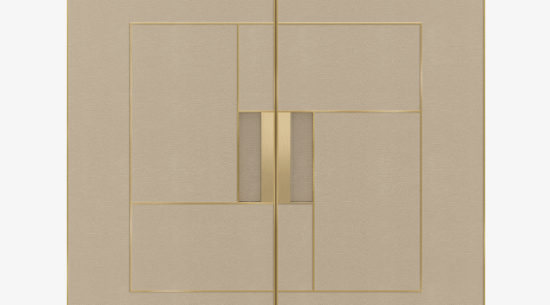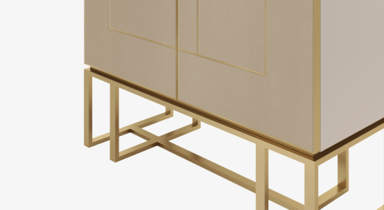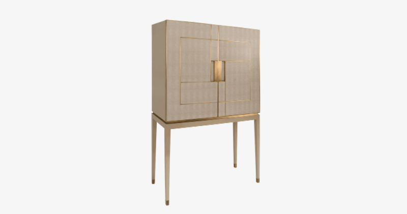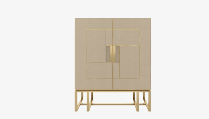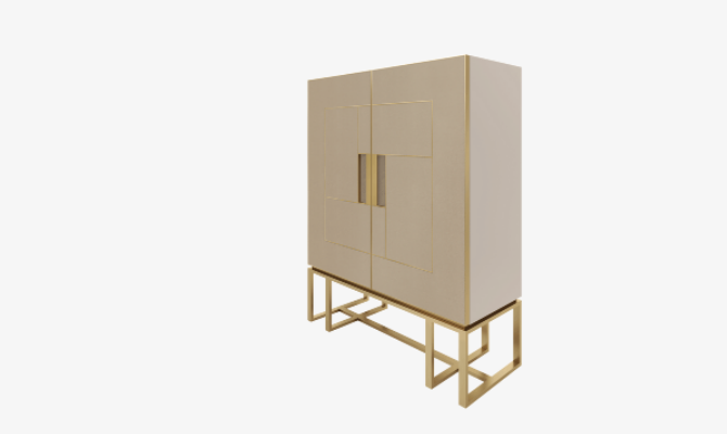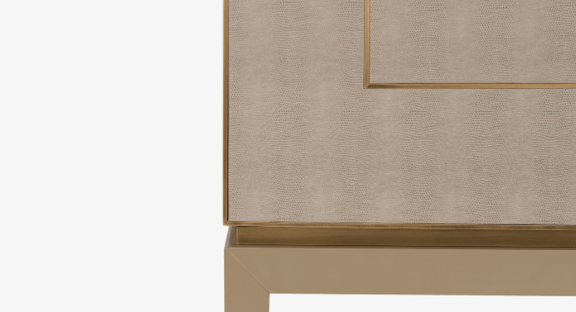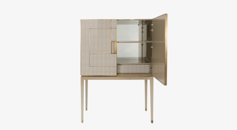The angular silhouette of the PIéMONT cabinet is heightened by the brushed-brass details that embellish its leather-inlaid doors and further amplified by the intricate form of the base. Open the double doors to reveal a suede-lined drawer, shelves and a luxurious mirrored background.