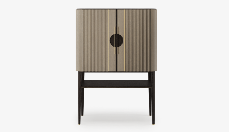 Fluted wood doors highlighted with accents of brushed brass and an open shelf distinguish the TAIPEI tall cabinet, a design with future heirloom aspirations.