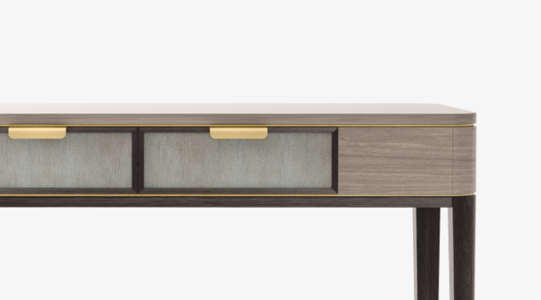 A contemporary dresser with timeless appeal, the MANDALAY employs a mix of materials in subtle and interesting ways. A blend of dark solid wood and beige-toned veneer highlighted with hints of brushed brass, the two drawers are inlaid with leather and internally lined with suede.