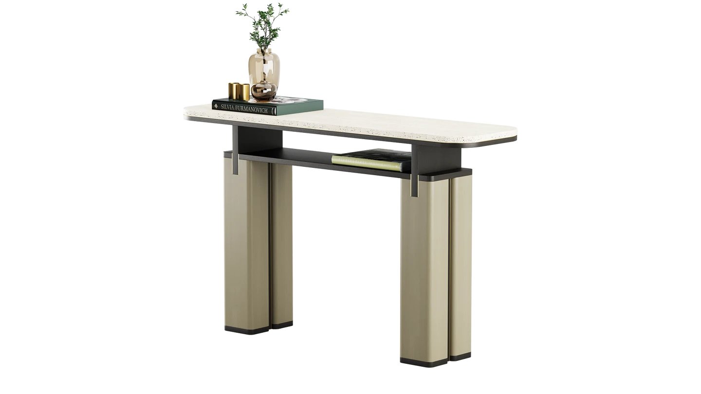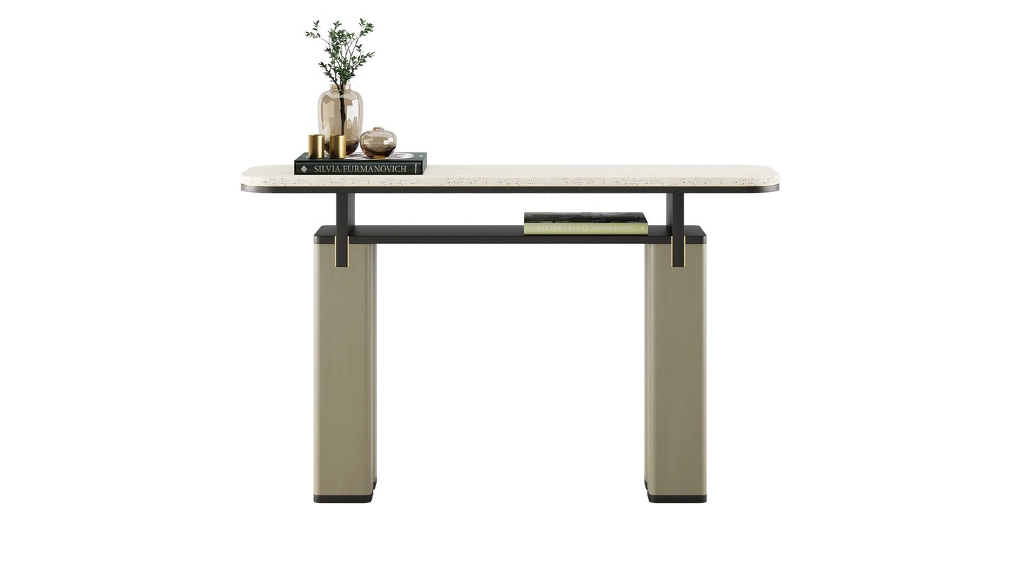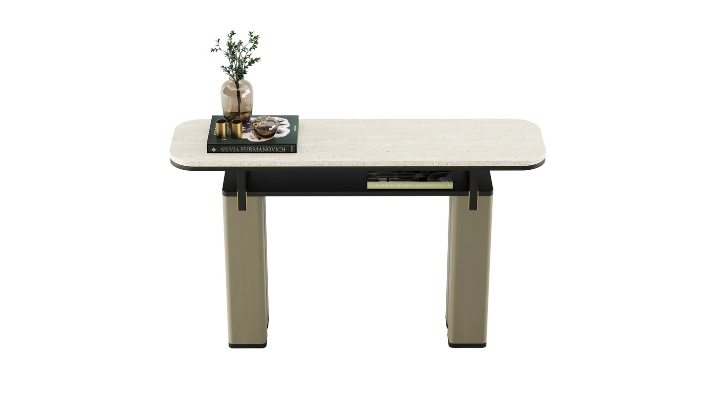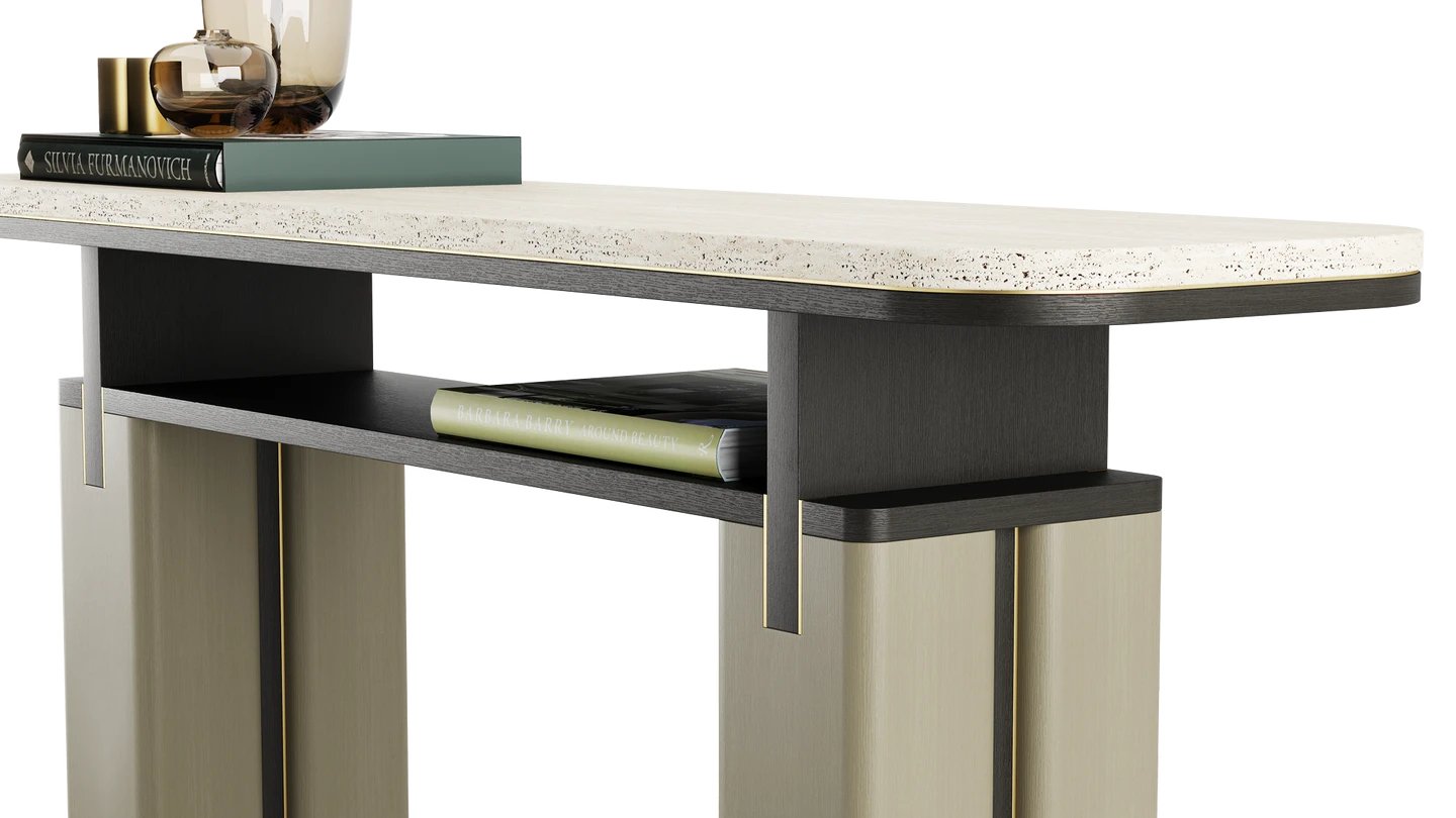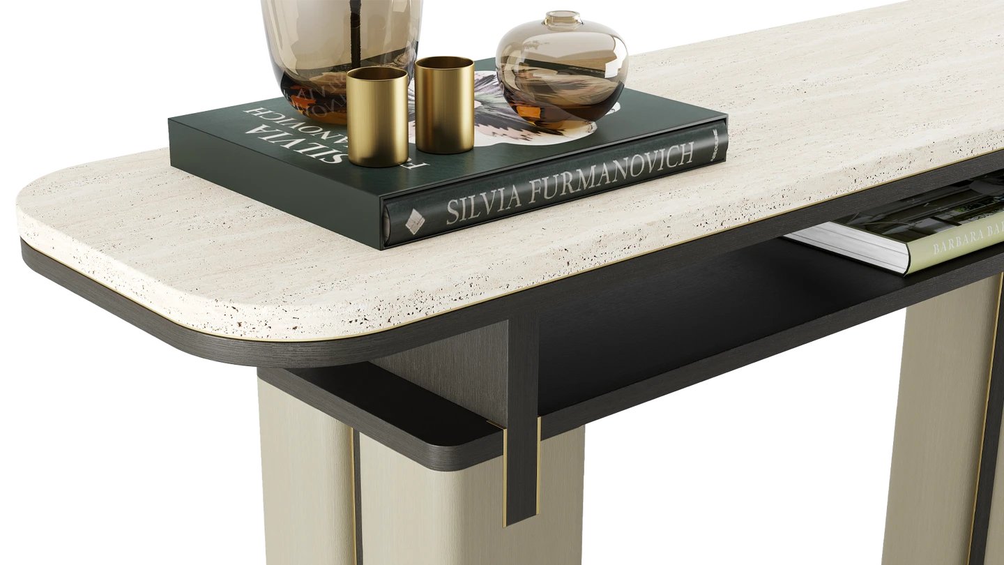 Our KAMAKURA Console is destined to add interest to your empty hall or corner. Inspired by the Japanese city, it has a bold, intricate shape, brought to life by a stone top and brushed brass details.