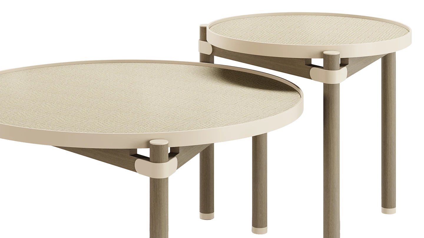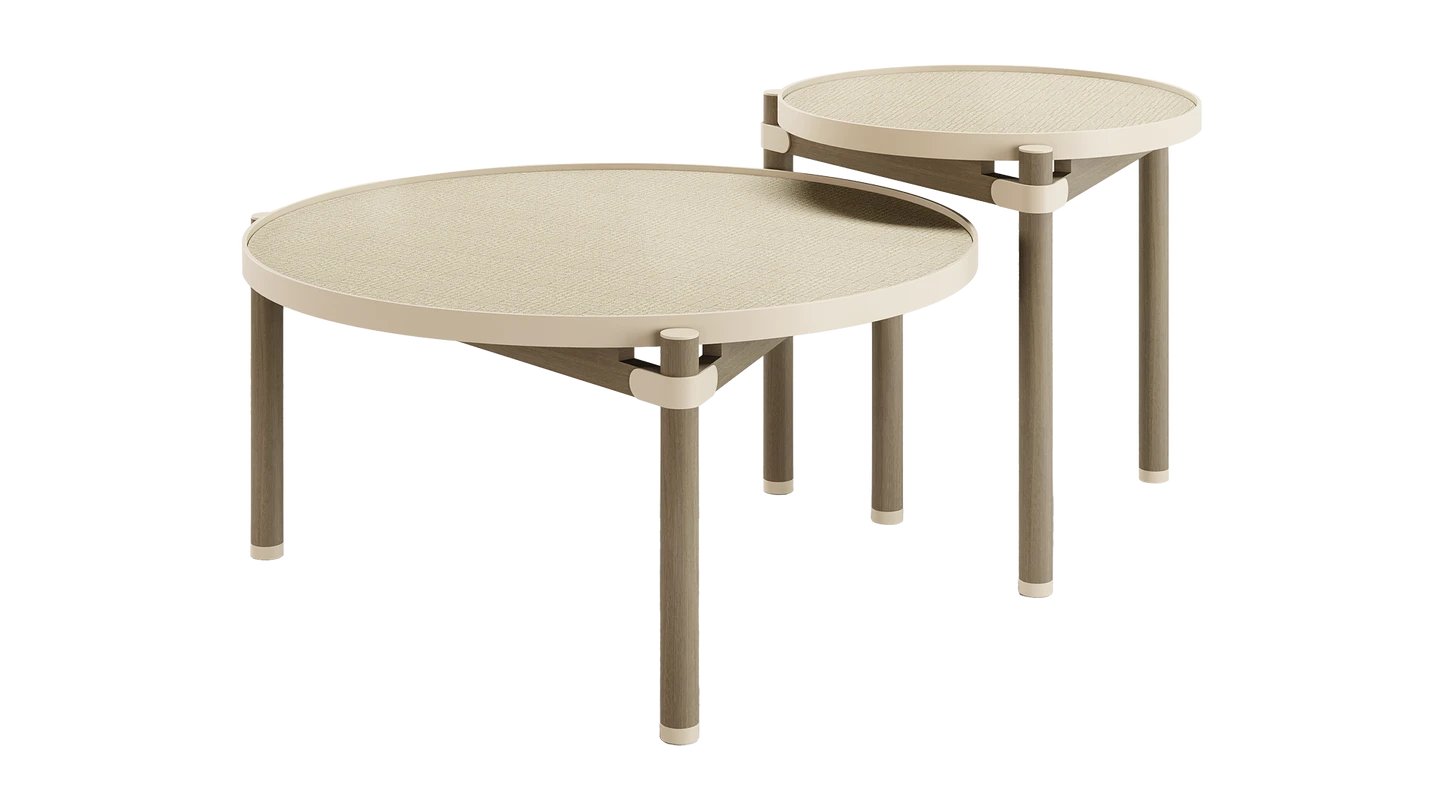 Combining stainless steel and solid wood, the TUFI Tables bring an industrial note to the patio. A leather inlay elevates the simple design for a touch of elegance.