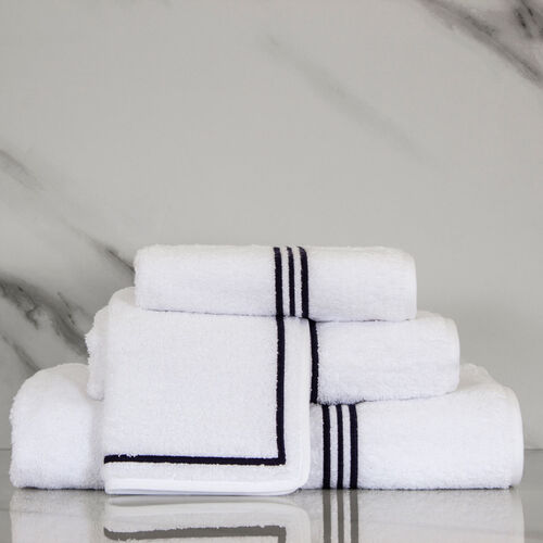 A super soft and plush cotton terry bath towel featuring a three-line embroidery finished with a cotton sateen border. Style with the coordinating bath sheet, hand towel, and wash cloth. 100% cotton. Made in Italy.