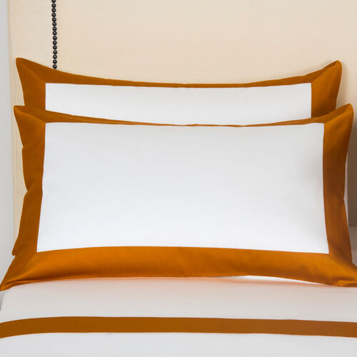 The Bold Pillowcase features soft, long-staple cotton sateen and a striking contrast border finished with a sleek simple stitch.