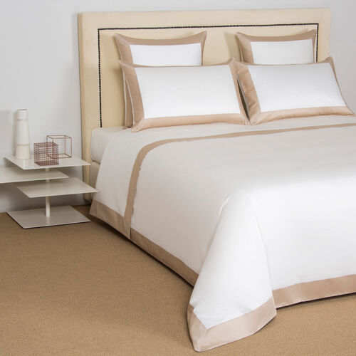 The Bold Pillowcase features soft, long-staple cotton sateen and a striking contrast border finished with a sleek simple stitch.