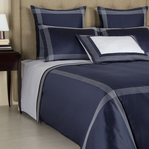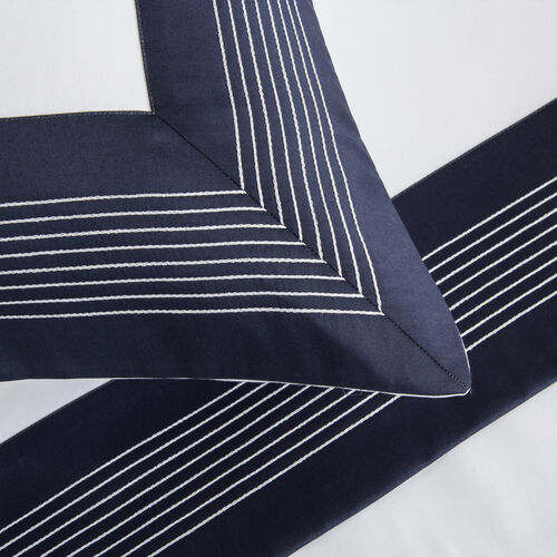 A contemporary Sheet Set from the Porto bedlinen range crafted in soft cotton sateen and finished with simple stitched hems. The upper sides of the pillowcases feature solid colour backgrounds with borders of narrow contrasting stripes while the undersides are plain.