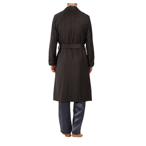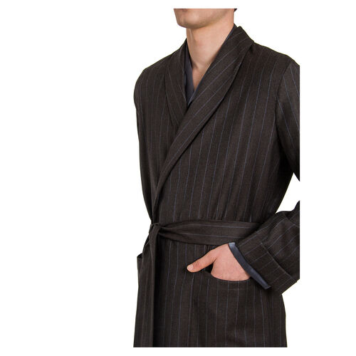 A handsome wool robe in a subtle striped pattern featuring dual deep front pockets and a coordinating belt.