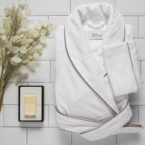 This luxurious Continental Bathrobe is crafted from pure fluffy cotton with a fine border of contrasting piping.