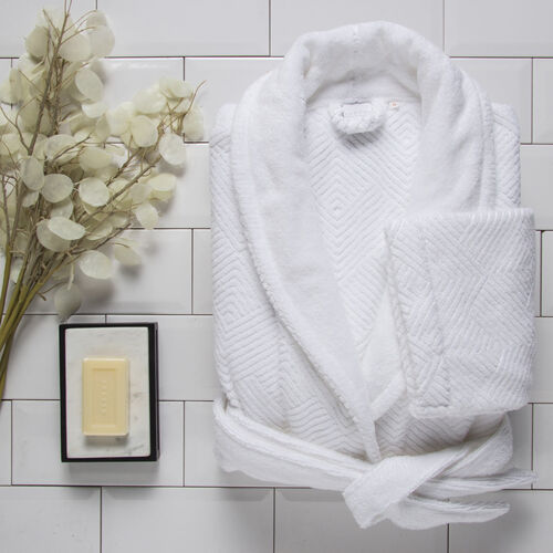 Produced from soft jacquard terry towel fabric, the Diamonds Bathrobe is complemented by wide patterned borders at the cuff and a hooded neck in a contrasting texture