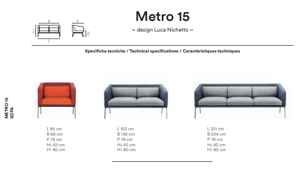 Metro 15 è una poltrona o divano a due e tre posti progettato dall’eclettico designer Luca Nichetto, vincitore di diversi riconoscimenti internazionali, quali: il Gran Design Award 2008, il Good Design Award del Chicago Atheneum Museum of Architecture 2008, l’IF Product Design Award 2008 e l’Elle Decoration.