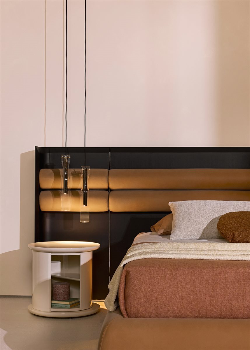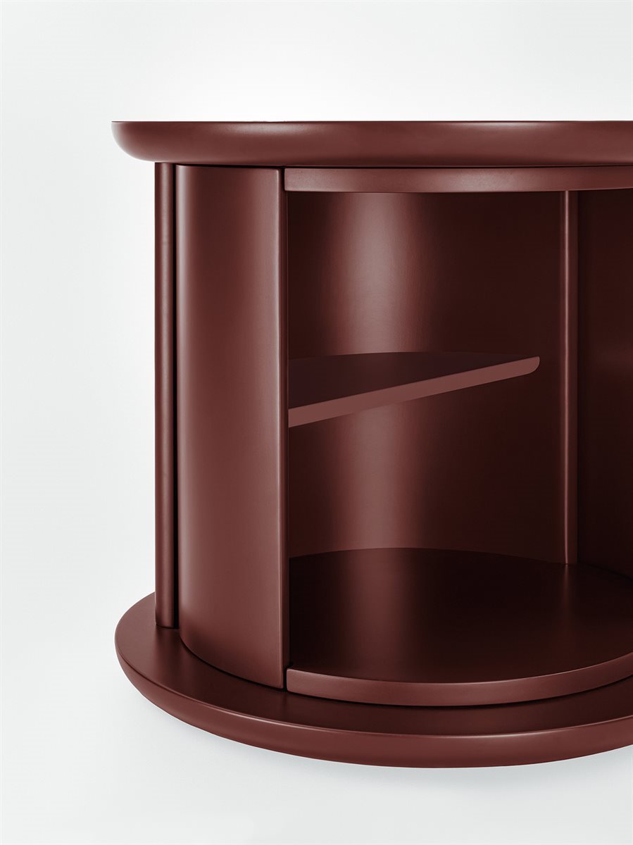 Tavolino con struttura, cilindro girevole e ripiano in legno laccato lucido o opaco. Colori disponibili: “Rosso Persia”, “Grigio Londra”, “Nero Giza”, "Bianco Camargue", "Verde Provenza", "Blu Pacifico", "Bordeaux Etruria", "Rosa Jaipur" e "Sabbia del Nilo".