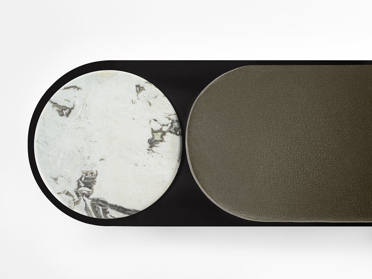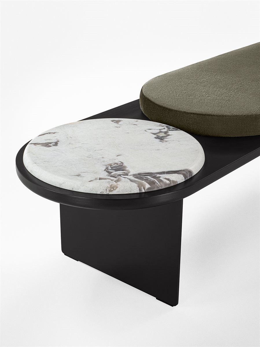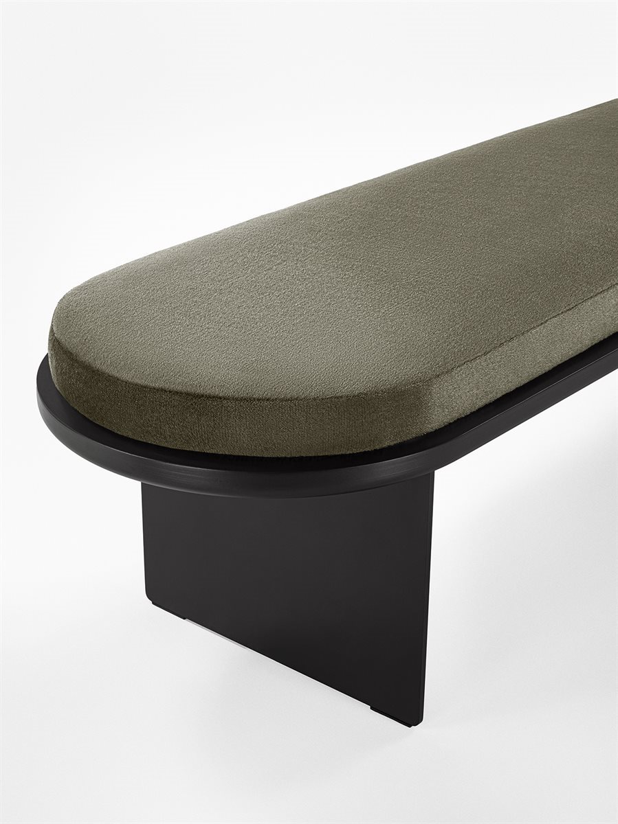 Panca con struttura in metallo e piano in legno laccato “deep black”. Sul top cuscino in poliuretano espanso altezza 6cm rivestito in tessuto o in pelle nei colori del campionario. Rivestimento non sfoderabile. Per panca 180cm disponibile versione con cuscino e piano di appoggio in cristallo 12mm molato a mezzo toro nella finitura esclusiva “Rosso Marte” oppure retroverniciato brillante nei colori del campionario. Disponibile anche in marmo 20mm Ceppo di Gré? spazzolato, Arabescato Orobico Rosso satinato, Bianco Carrara Gioia satinato oppure Dover White satinato.