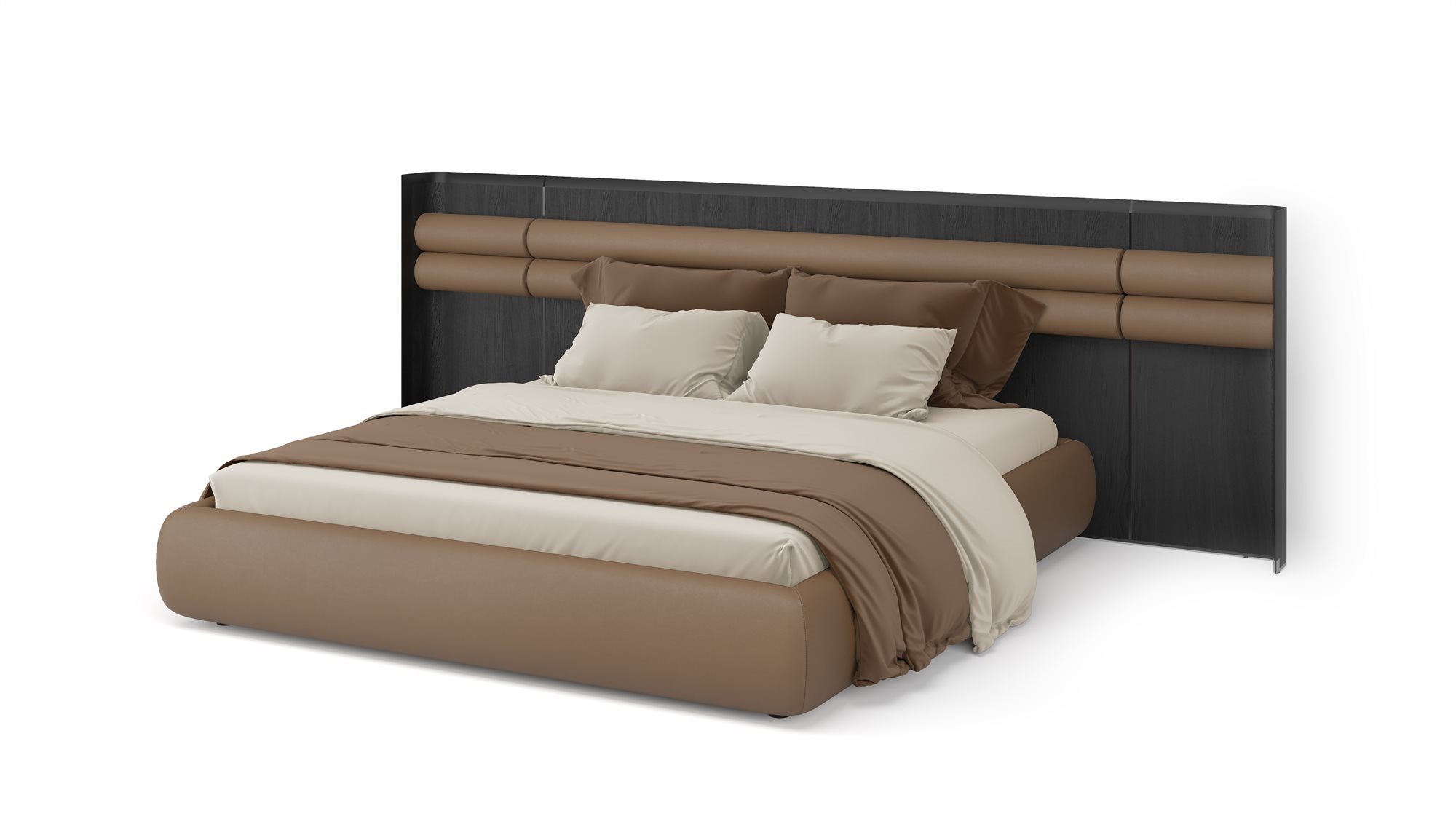Letto imbottito in poliuretano espanso indeformabile a densità differenziate e fibra poliestere e testata autoportante in frassino curvato tinto nero poro aperto con poggiatesta in poliuretano espanso. Disponibile anche versione laccata opaca nei colori: “Rosso Persia”, “Grigio Londra”, “Nero Giza”, "Bianco Camargue", "Verde Provenza", "Blu Pacifico", "Bordeaux Etruria", "Rosa Jaipur" e "Sabbia del Nilo". Disponibile con rivestimento in tessuto o pelle nei colori di campionario. Rete a doghe inclusa. Dettagli in metallo nickelato nero. Giroletto sfoderabile. Poggiatesta sfoderabile escluso Cat. L1, L2 e pelle cliente/C.O.L. Per la realizzazione di elementi con rivestimento in pelle sono necessarie cuciture aggiuntive rispetto gli elementi con rivestimento in tessuto.