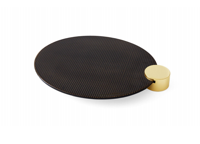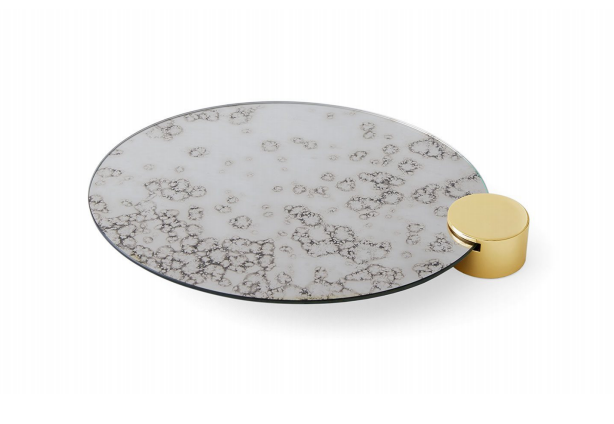 Tray in antiqued mirror or decorated glass. Brassed metal support.