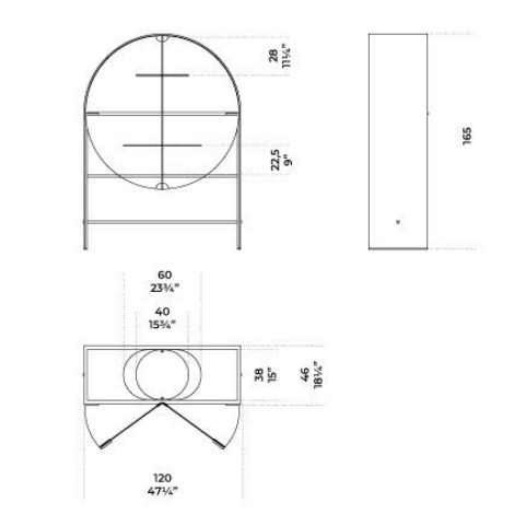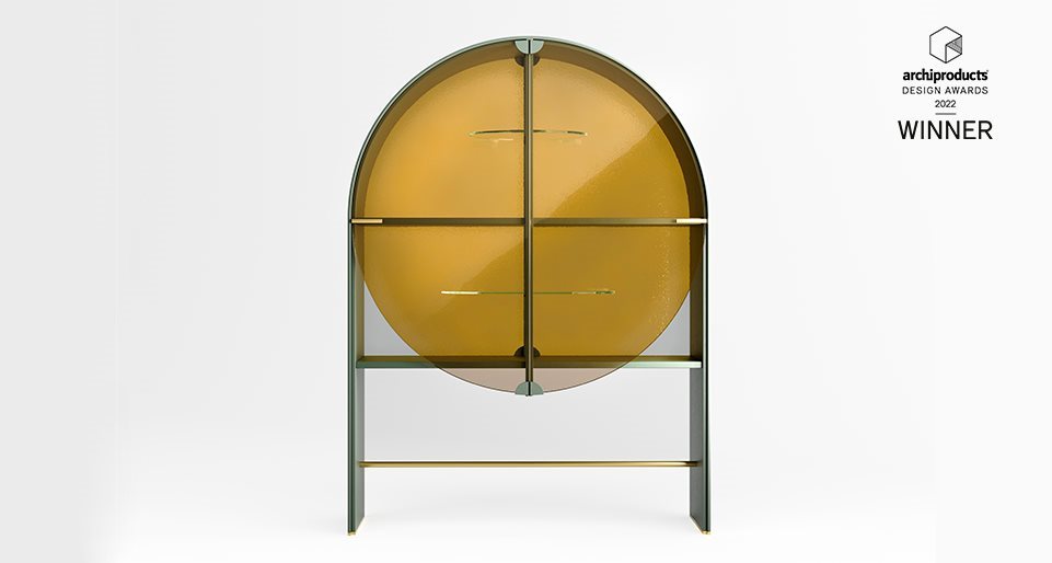 Vetrina con struttura in legno laccato color “elephant grey”. Anta in cristallo 6mm temperato pigmentato color ambra. Schienale e ripiani in cristallo “Grigio Italia” 6mm temperato. Dettagli in ottone satinato.