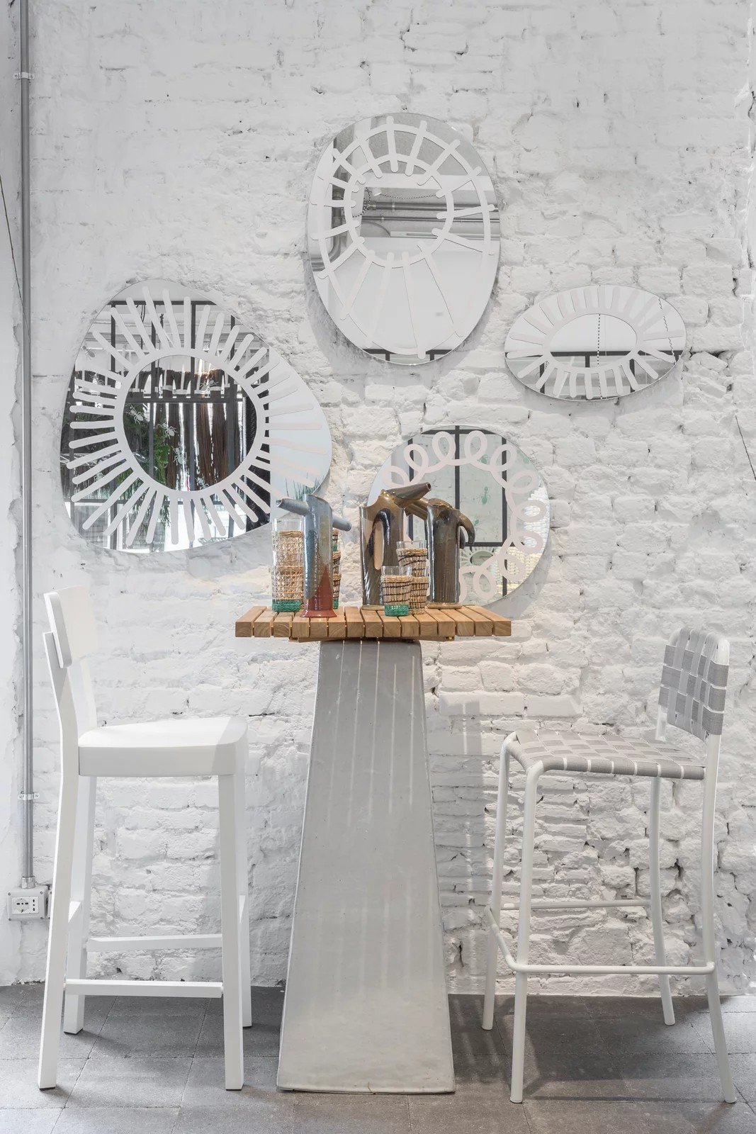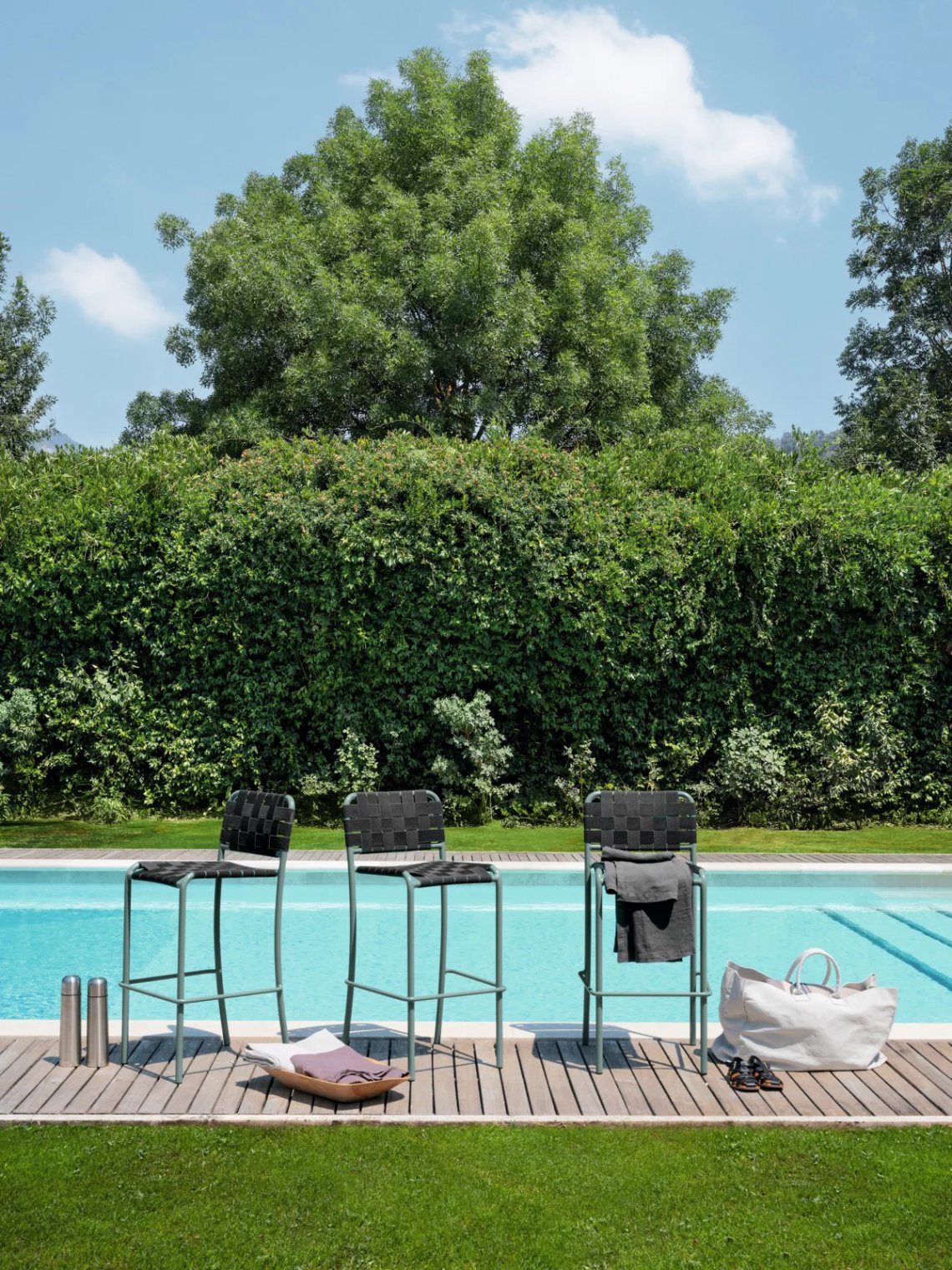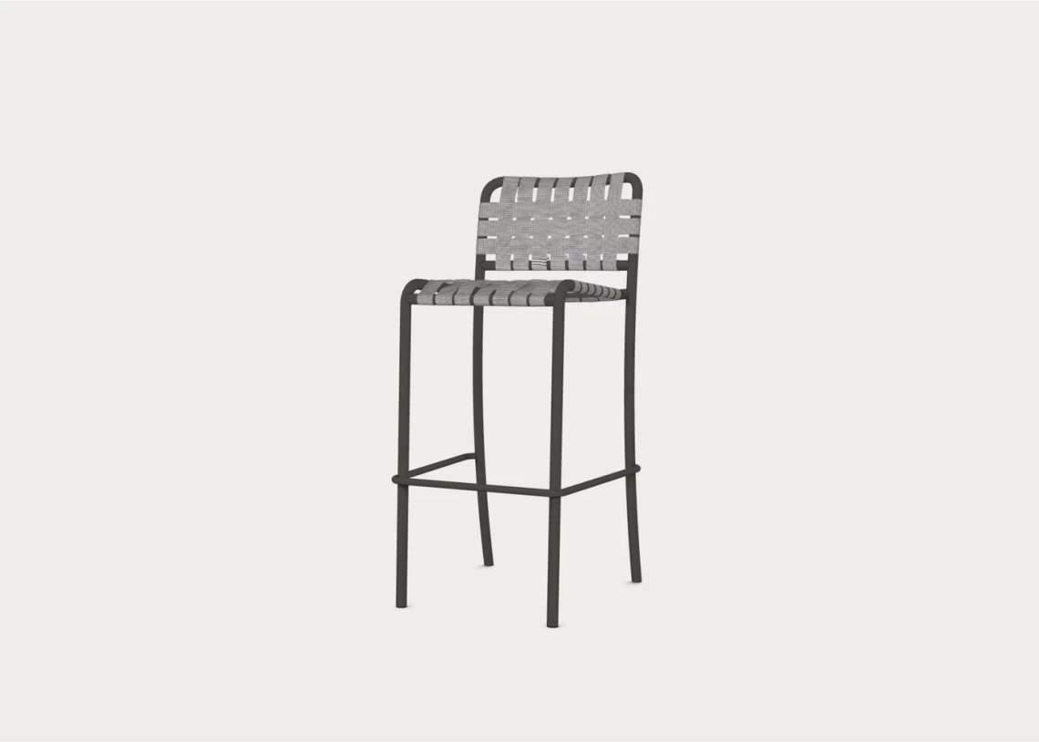 Sgabello caratterizzato da struttura essenziale e minimal, Inout 828si sviluppa attorno ad una leggera struttura in tubolare di alluminio verniciato goffrato nei colori Pearl, Oxido, Agate o Slate,  materiale ecologico ed unico per qualità tecniche. A questo si aggiunge un particolare intreccio in cinghia elastica grigia, nera, blu o tabacco, un prodotto innovativo a base di gomma sintetica e propilene.