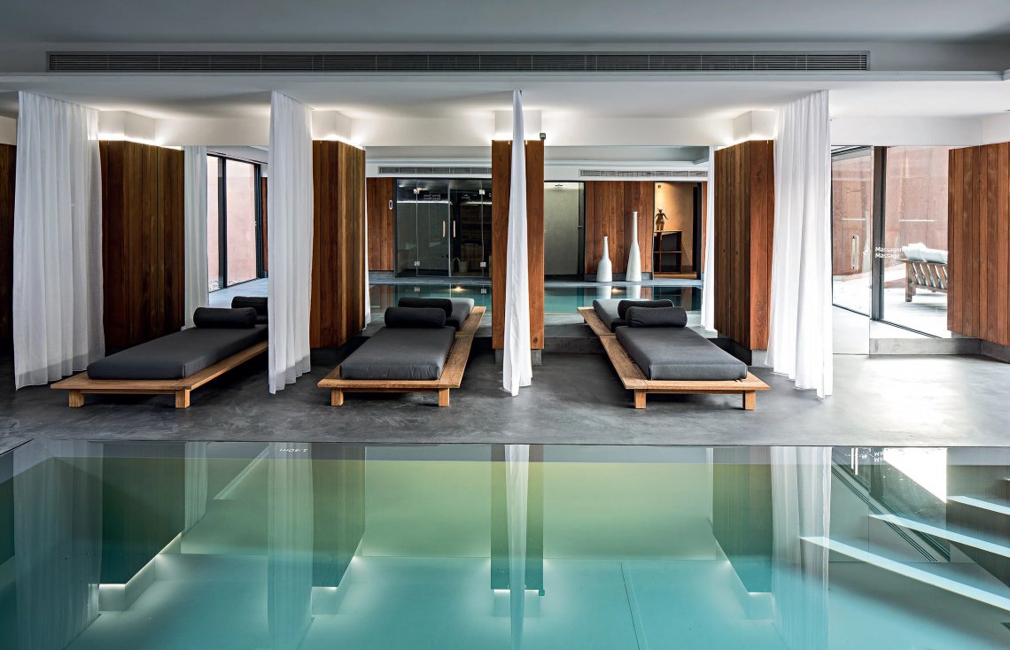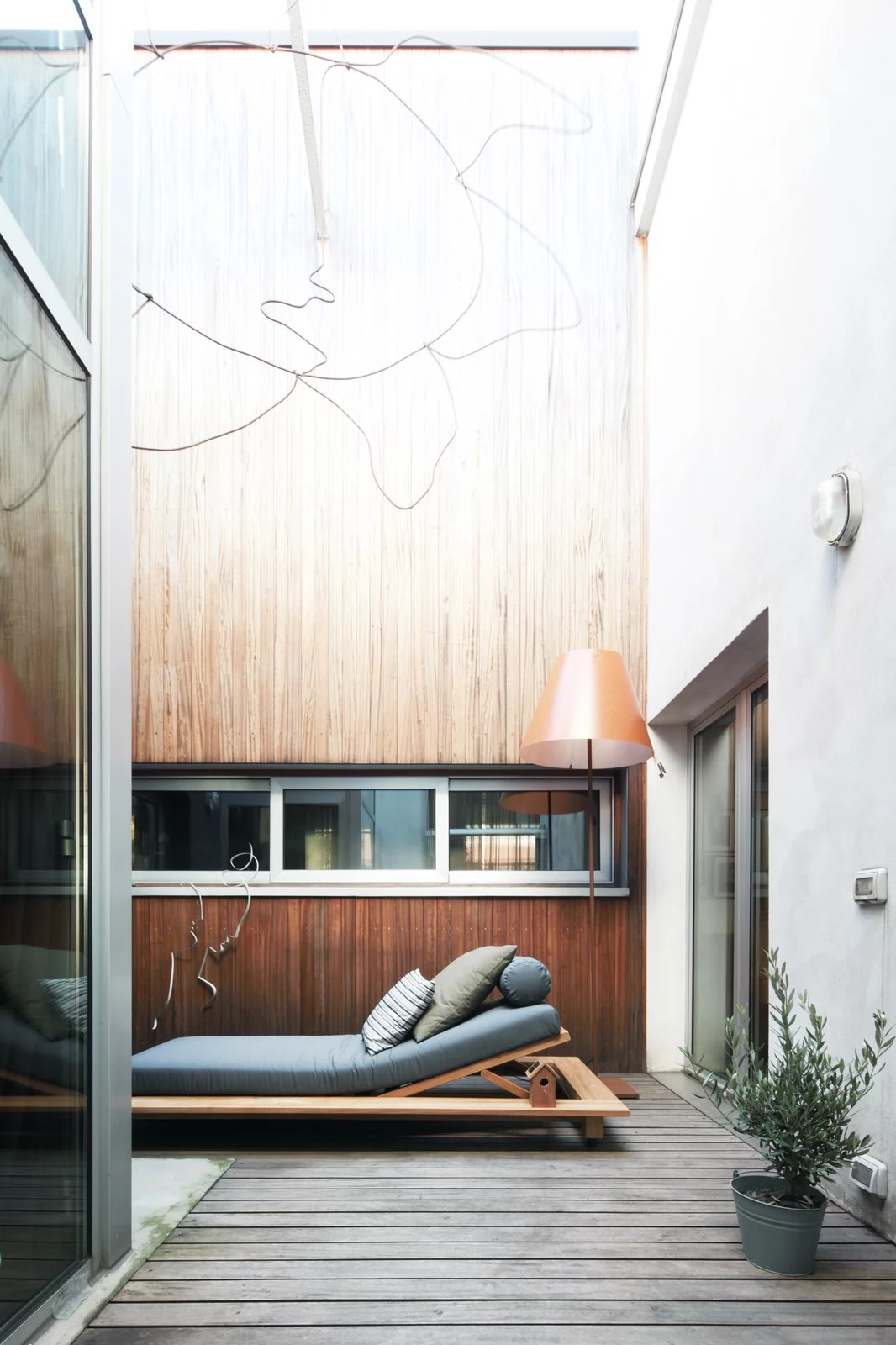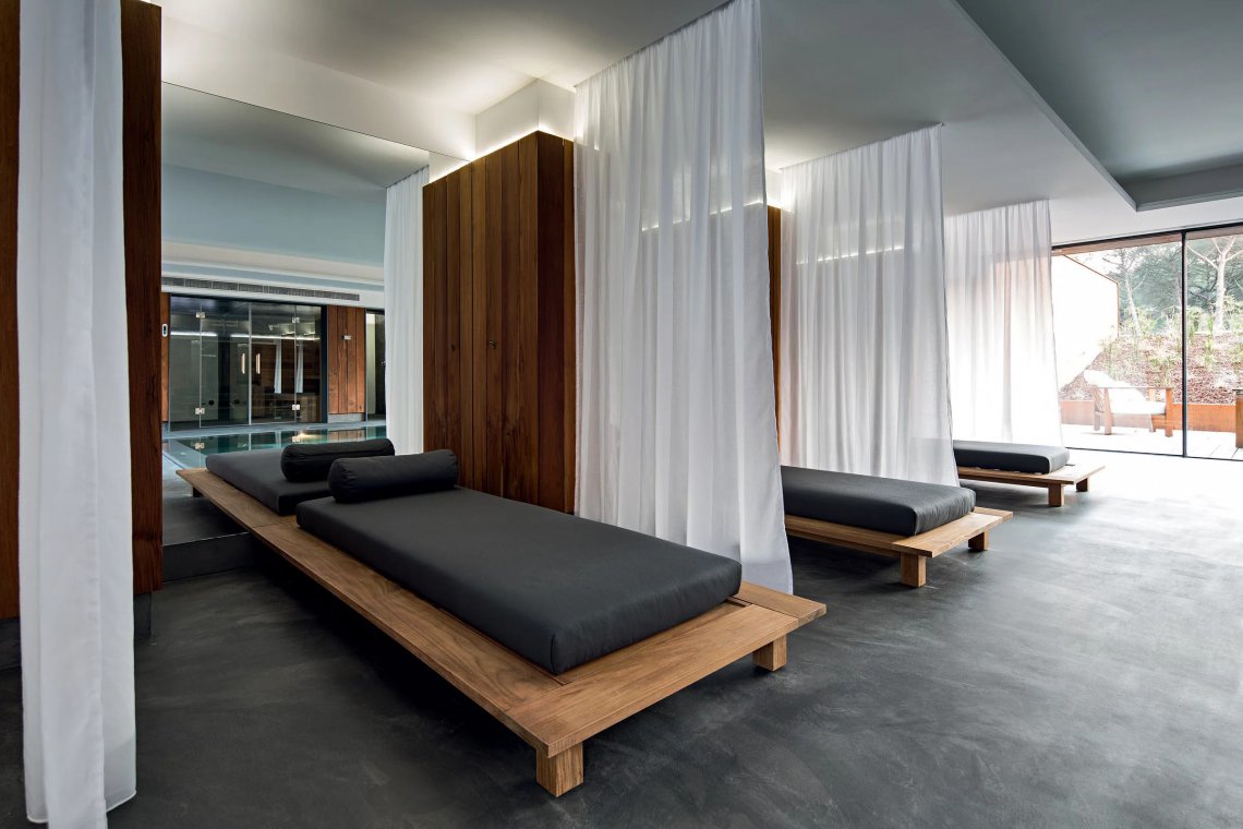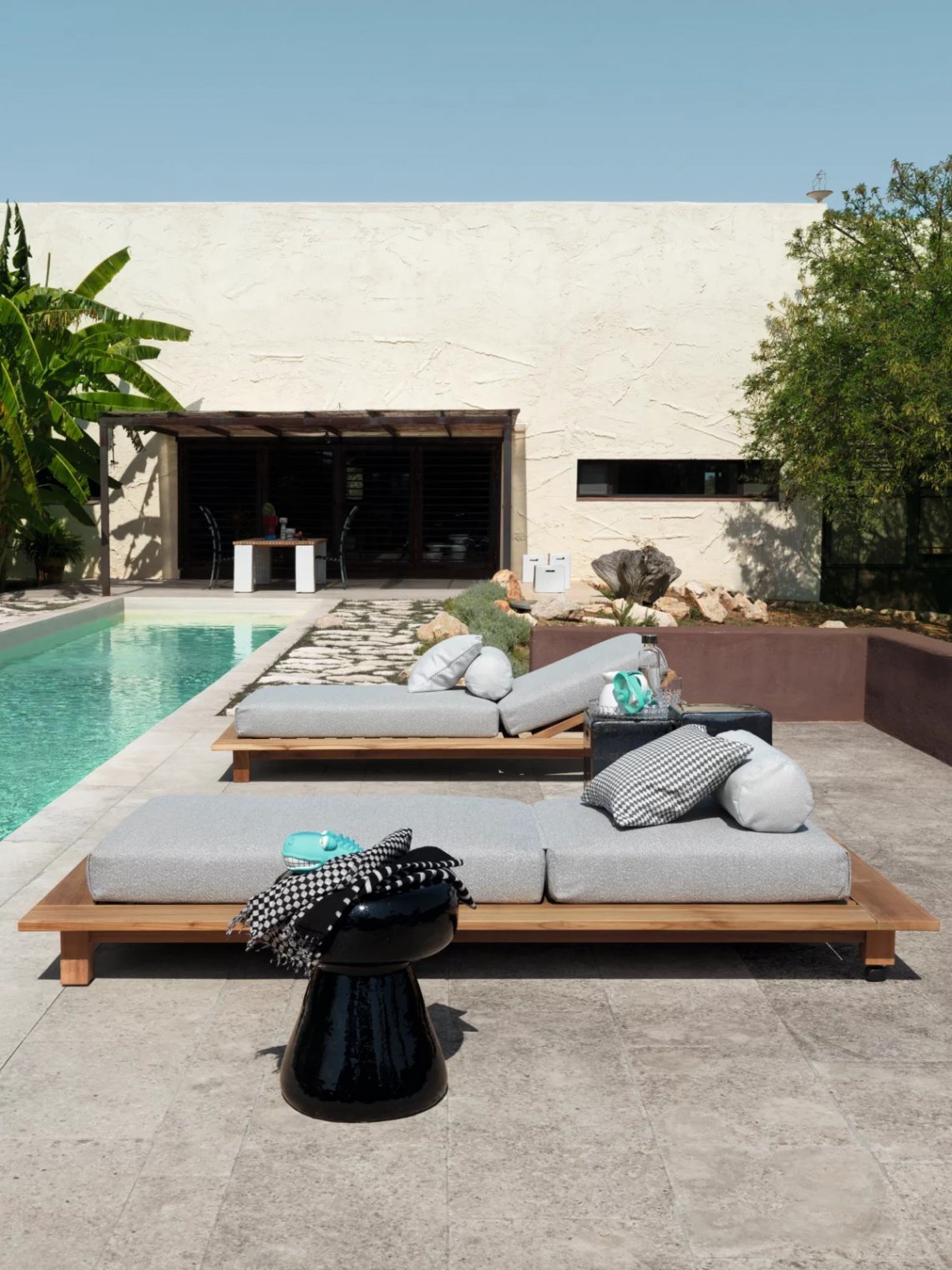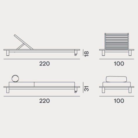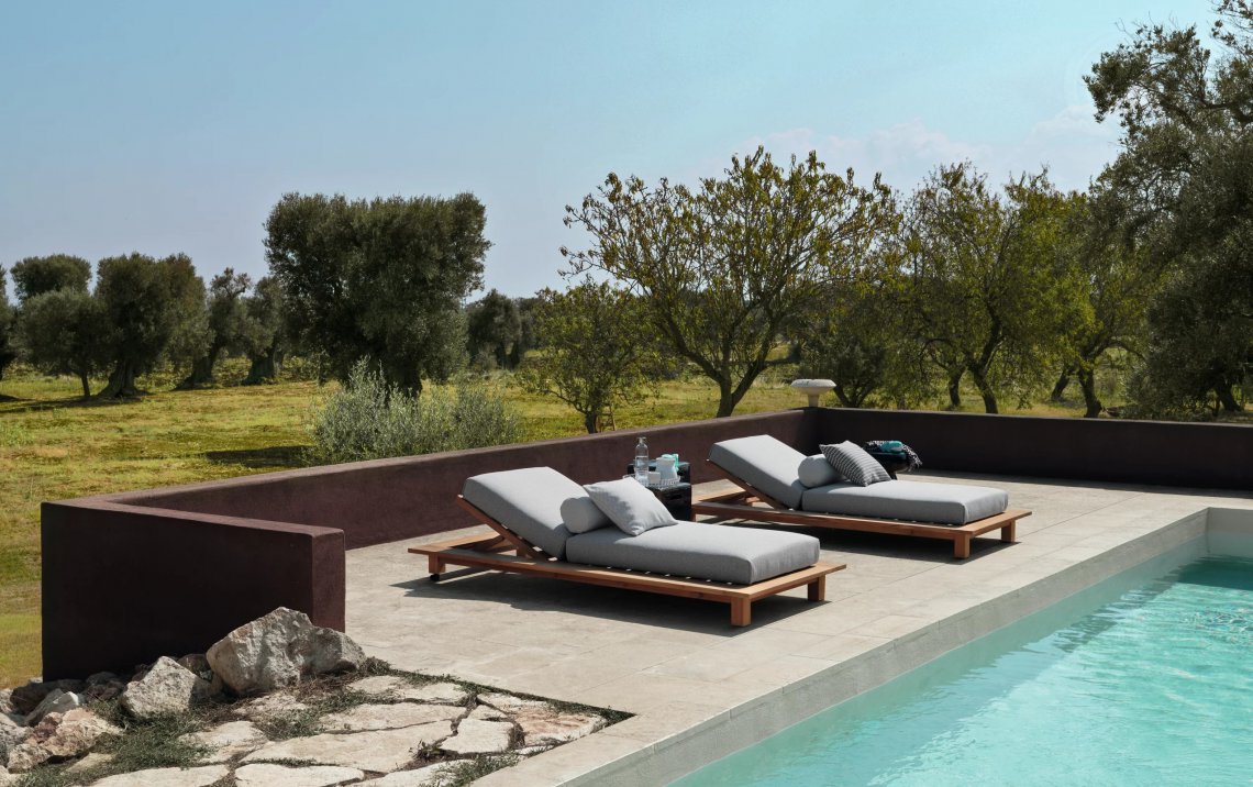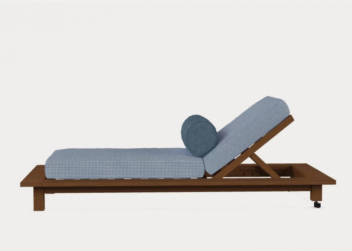 Il lettino Inout 81 è caratterizzato da una struttura reclinabile che combina la duttilità e resistenza del teak naturale a un materasso imbottito e sfoderabile con cuscini volanti per una maggiore morbidezza.