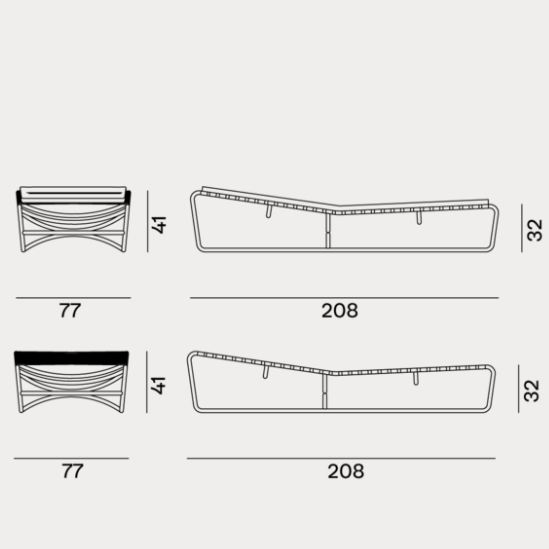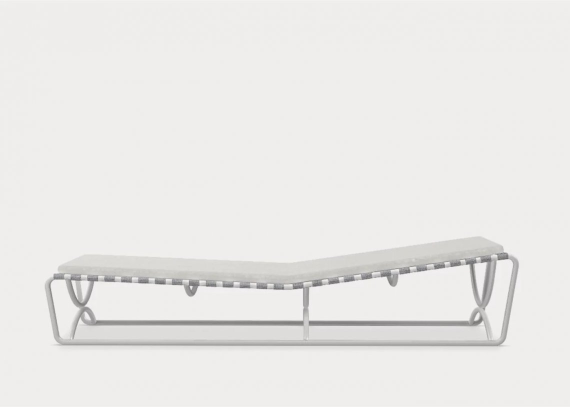Il lettino Inout 884 è caratterizzato da una struttura fissa, non reclinabile, in alluminio verniciato opaco bianco, grigio o salvia. La struttura è arricchita da un intreccio di cinghia elastica blu, nero, tabacco o grigio, sul quale adagiare un eventuale materassino sfoderabile imbottito per una maggiore morbidezza.
