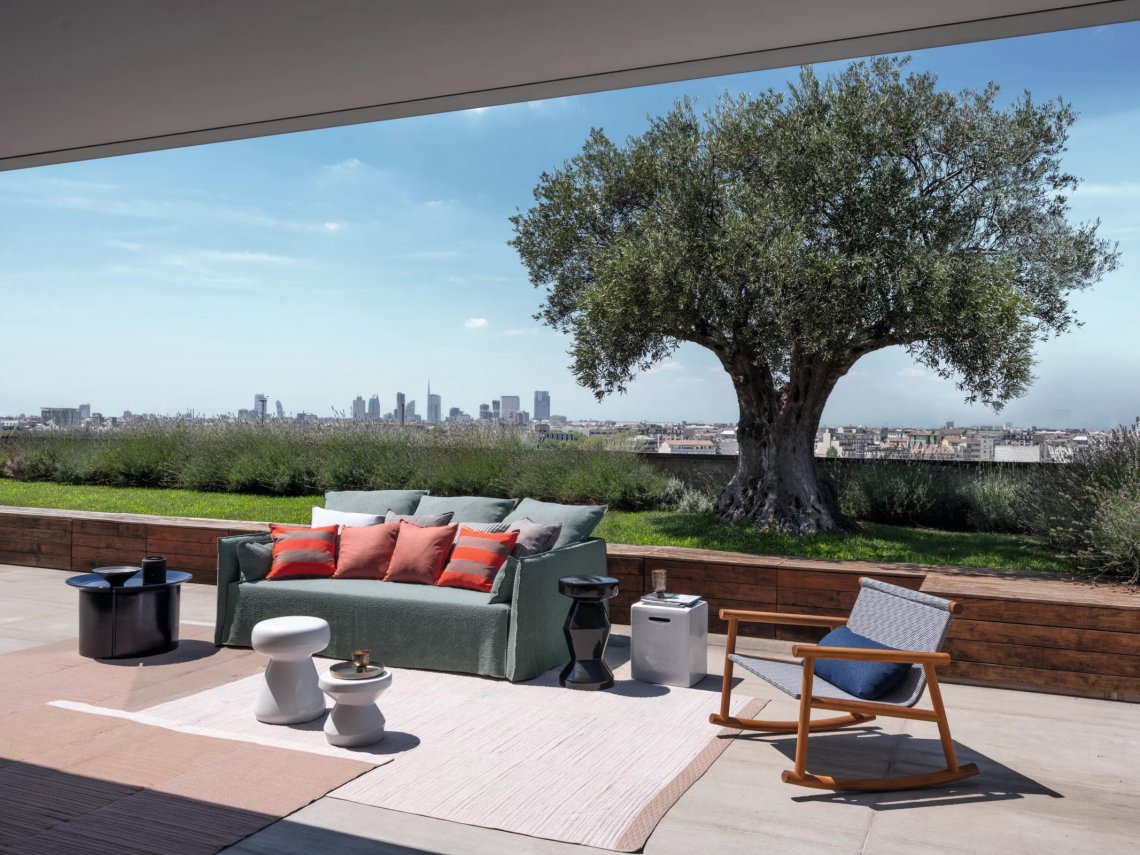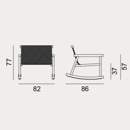 Dondolo con struttura in iroko e scocca in acciaio con trattamento per esterno. Il tessuto tecnico Jaquard Outdoor Accardi, che avvolge e fascia inferiormente e superiormente gli elementi in legno iroko, è un tessuto sostenibile, leggero ed impermeabile e lavorato attentamente da artigiani tessitori. Il risultato finale crea un disegno tramato che si sposa armonicamente con la struttura in legno con sezione irregolare, evidenziando ancora una volta il rimando al giapponesismo e alla tradizione artigianale locale.