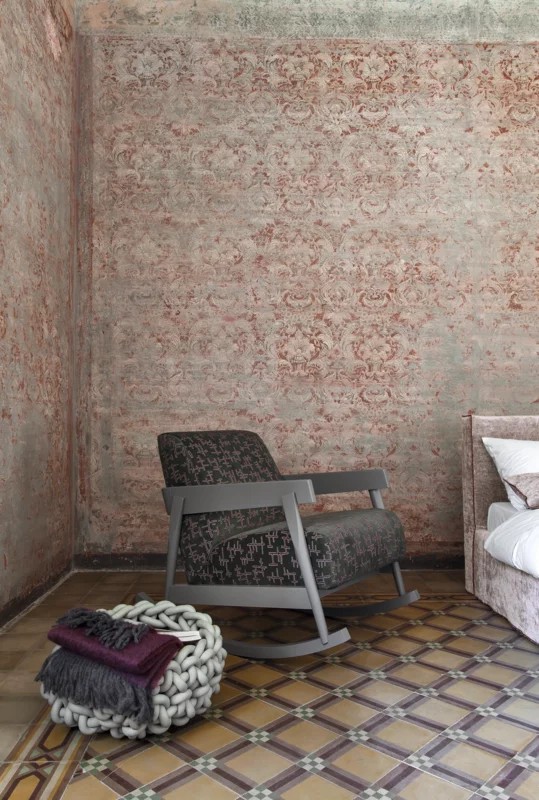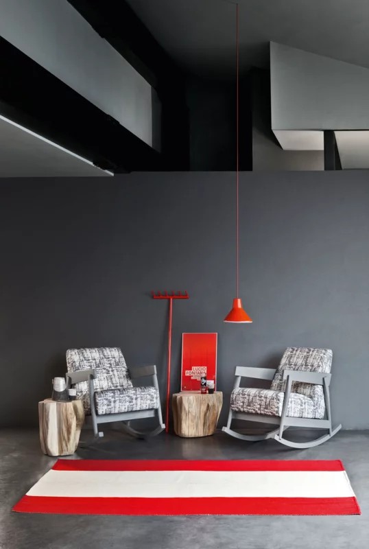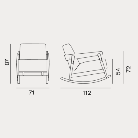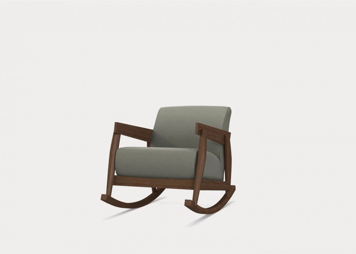Sedia a dondolo in legno massello di noce Canaletto naturale, rovere sbiancato o rovere laccato bianco, grigio, nero, oceano o tortora, Brick 307 ha la seduta e lo schienale ammorbiditi da un unico importante cuscino imbottito in poliuretano espanso dal rivestimento sfoderabile. I diversi elementi in legno che compongono la struttura sono evidenti, inclinati e sovrapposti.