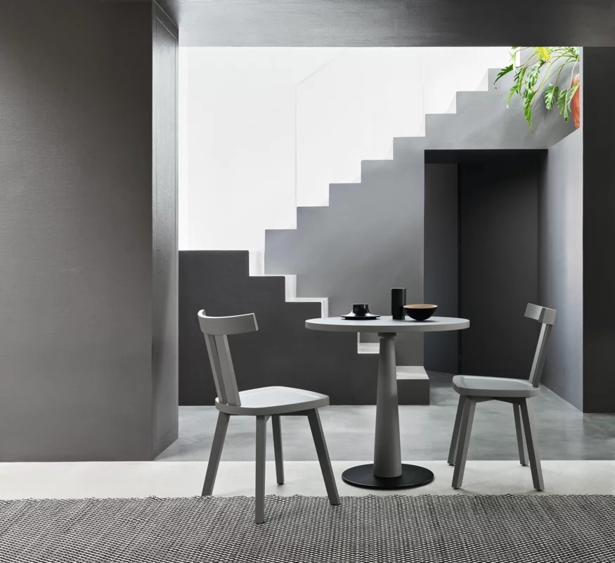 Gray 39 è un tavolo dal piano rotondo, definito dalla combinazione del massello di noce Canaletto verniciato naturale; laccato bianco, grigio, nero, oceano o tortora utilizzato per il piano e la gamba a colonna.
