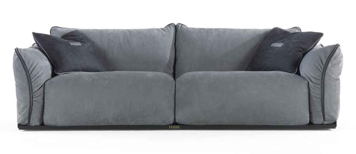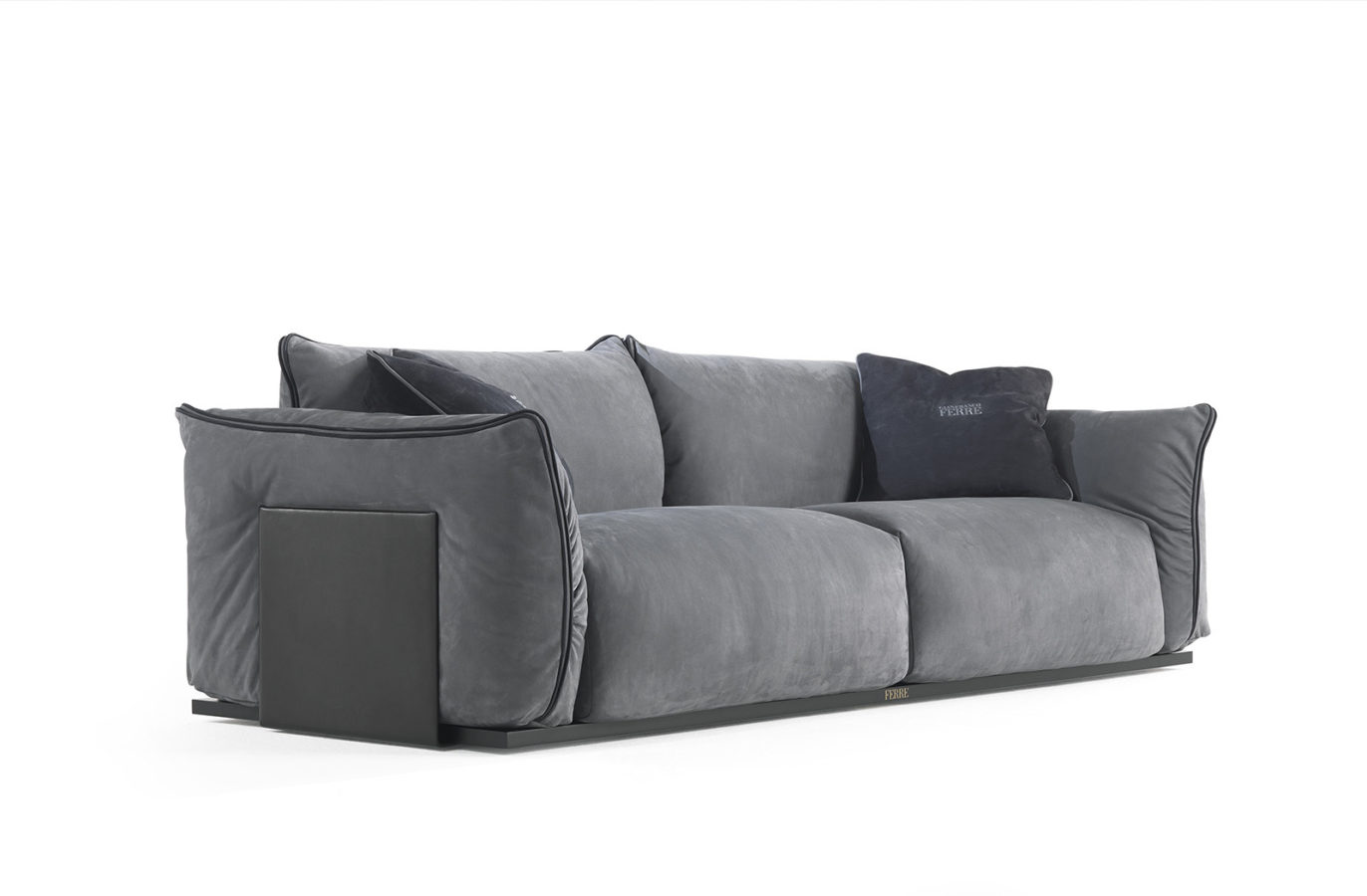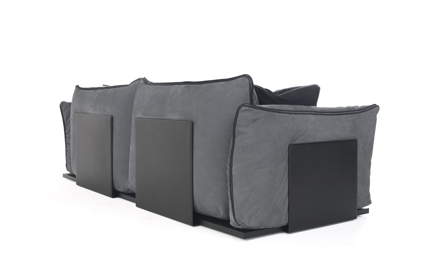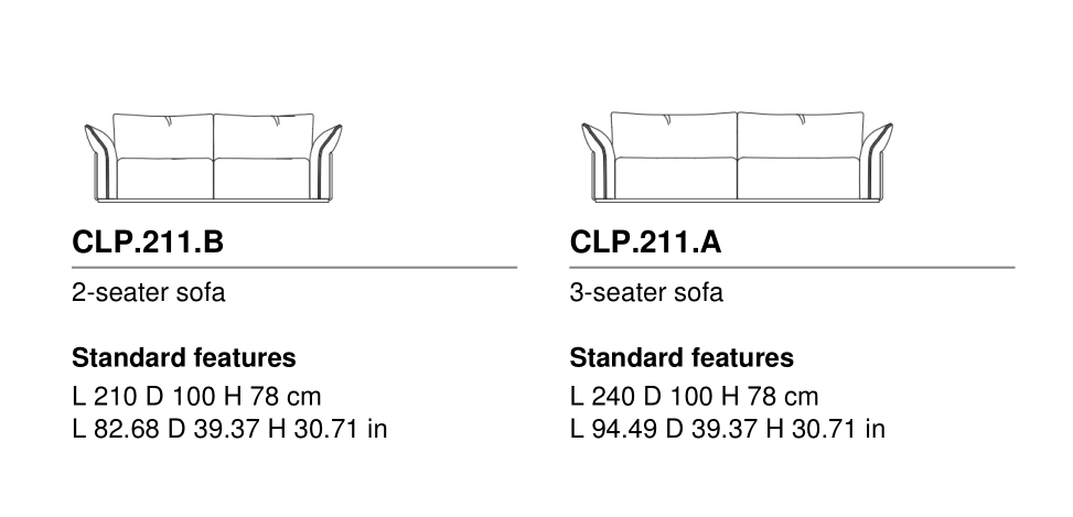 3-seater sofa with structure in beech wood and foam. Upholstery in leather cat. B | L.08.07 with double piping in leather cat. B | L.08.10. External plates in metal upholstered in leather cat. A | L.02.05. Base in black lacquered wood.