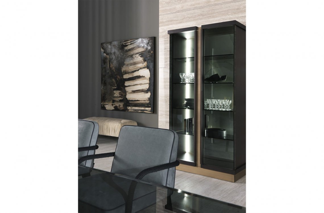 The essential aesthetic meets the urban suggestions and the vintage references in the Sean showcase. A piece of furniture characterized by an interesting combination of materials with different chromatic effects, such as Tay wood tinted smokey grey and bronze finish on the central strip and on the base.
