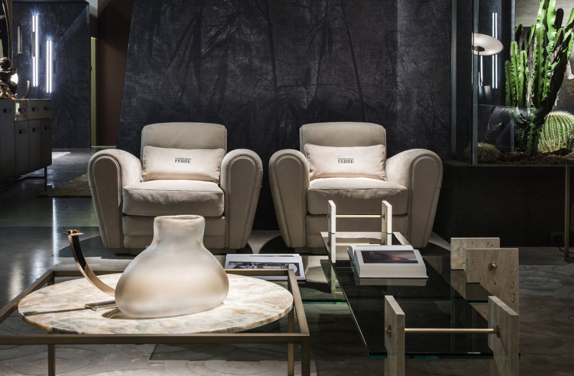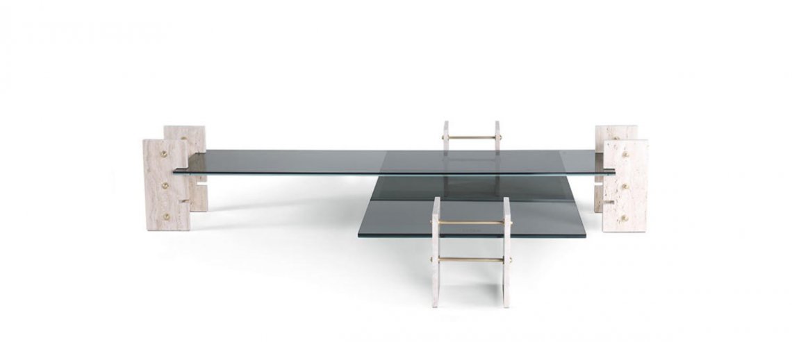The Fitzroy line epitomises the industrial style which runs throughout the collection. These pieces, with a 1970s feel, recall the shape of the mechanical devices and are made of travertine marble, brass and smoked glass.