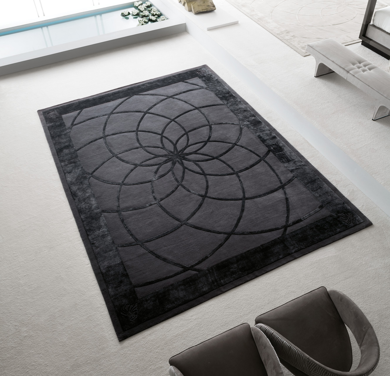 Hand knotted black carpet in combination of wool & 100% silk. Custom made.