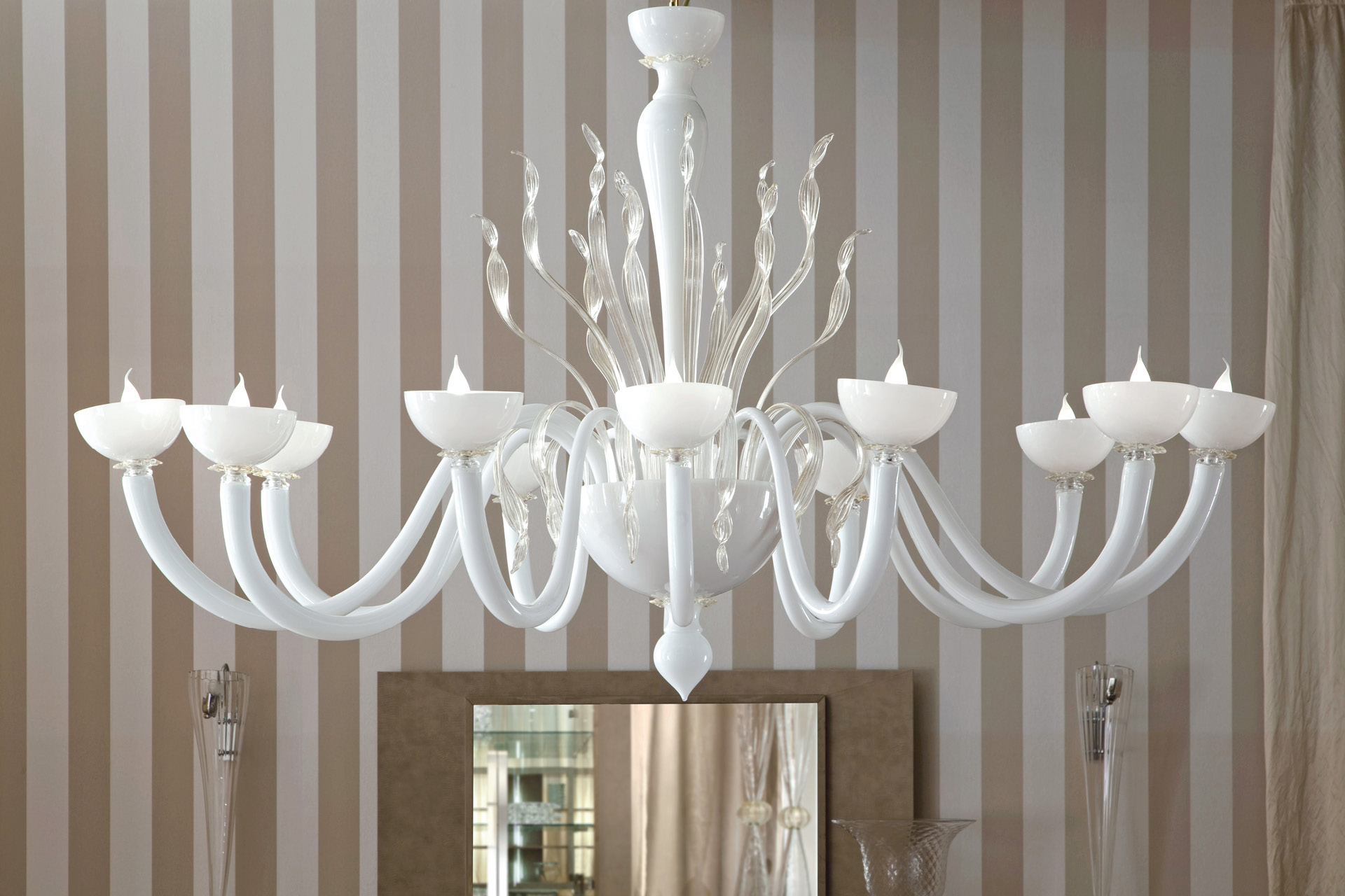 Venetian "Murano" blown glass oval chandelier in white colour. 16 lights and Venetian "Murano" gold blow glass inserts.