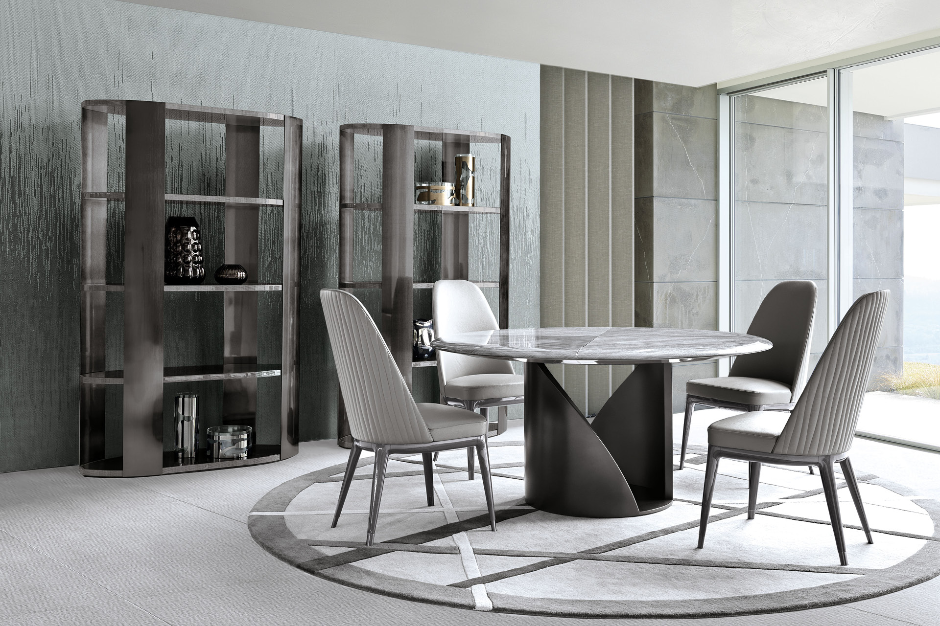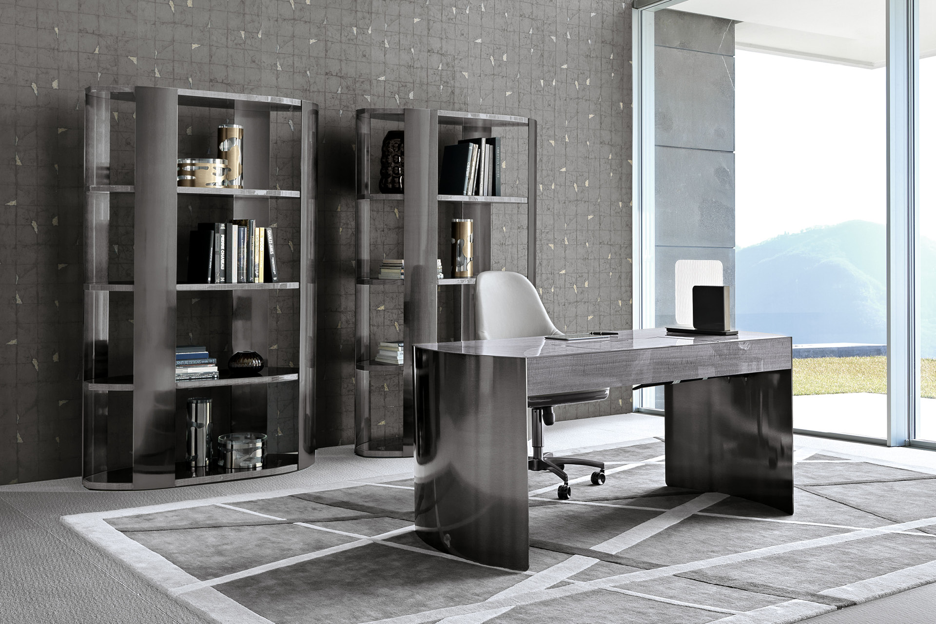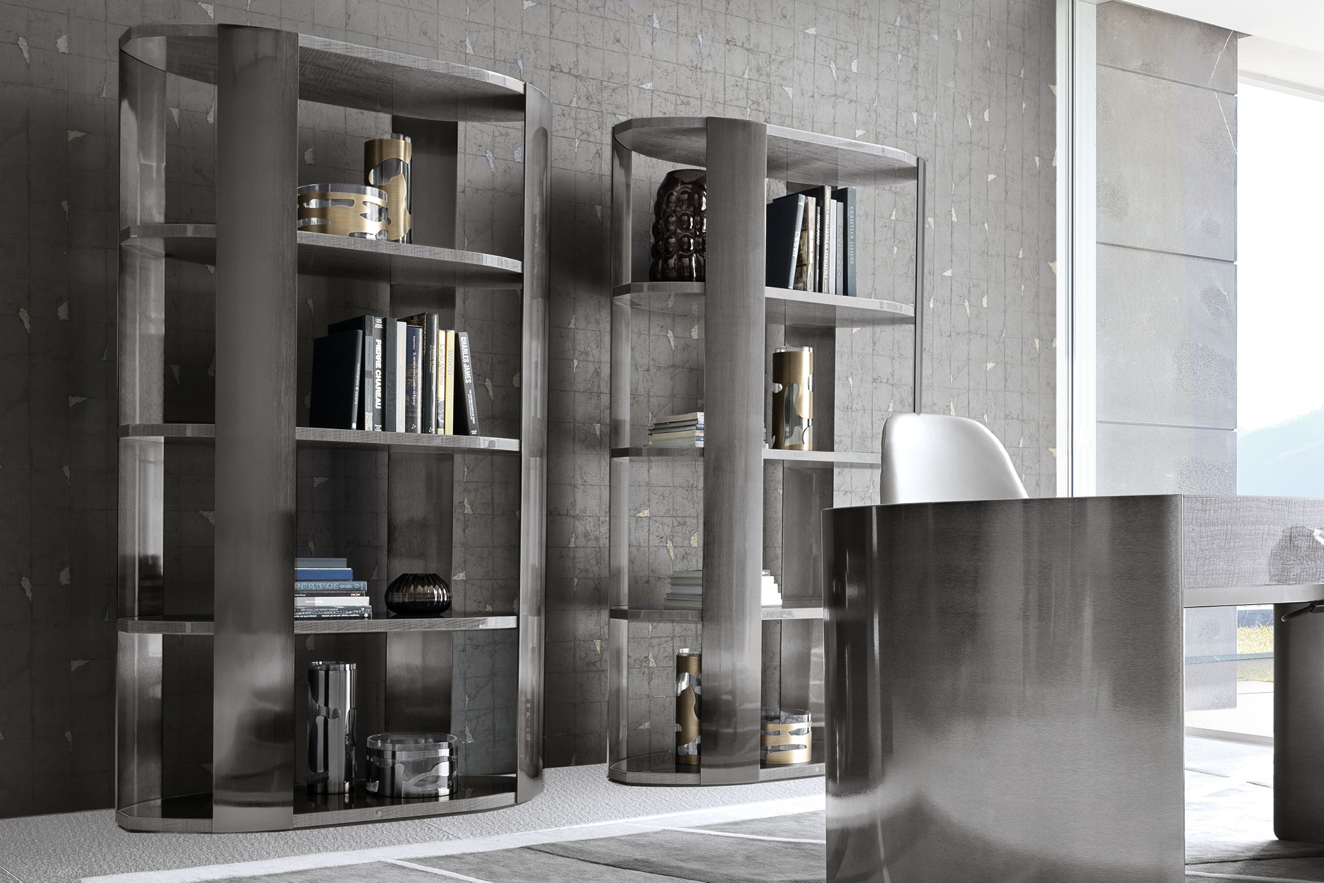 Bookcase with structure in satin black nickel stainless steel with Giorgio Collection logo on the base. 3 fixed shelves in smoked tempered glass with frame in Madagascar figured Mowinghi veneer with high gloss polyester finish.