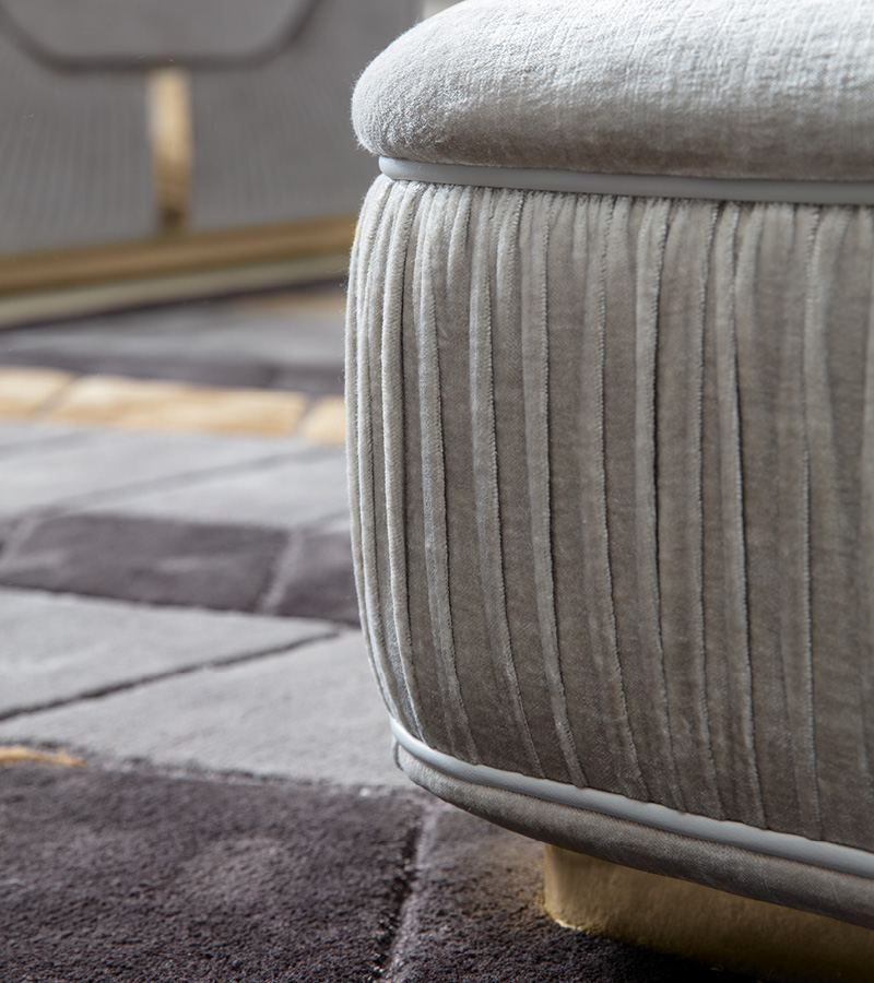 Ottoman/cocktail table with quilted side parts available in first grade leather,nubuk leather, lizard printed leather, velvet or suede fabric. Seat in polyurethane foam wrapped in down feather. Base in light gold chrome stainless steel.